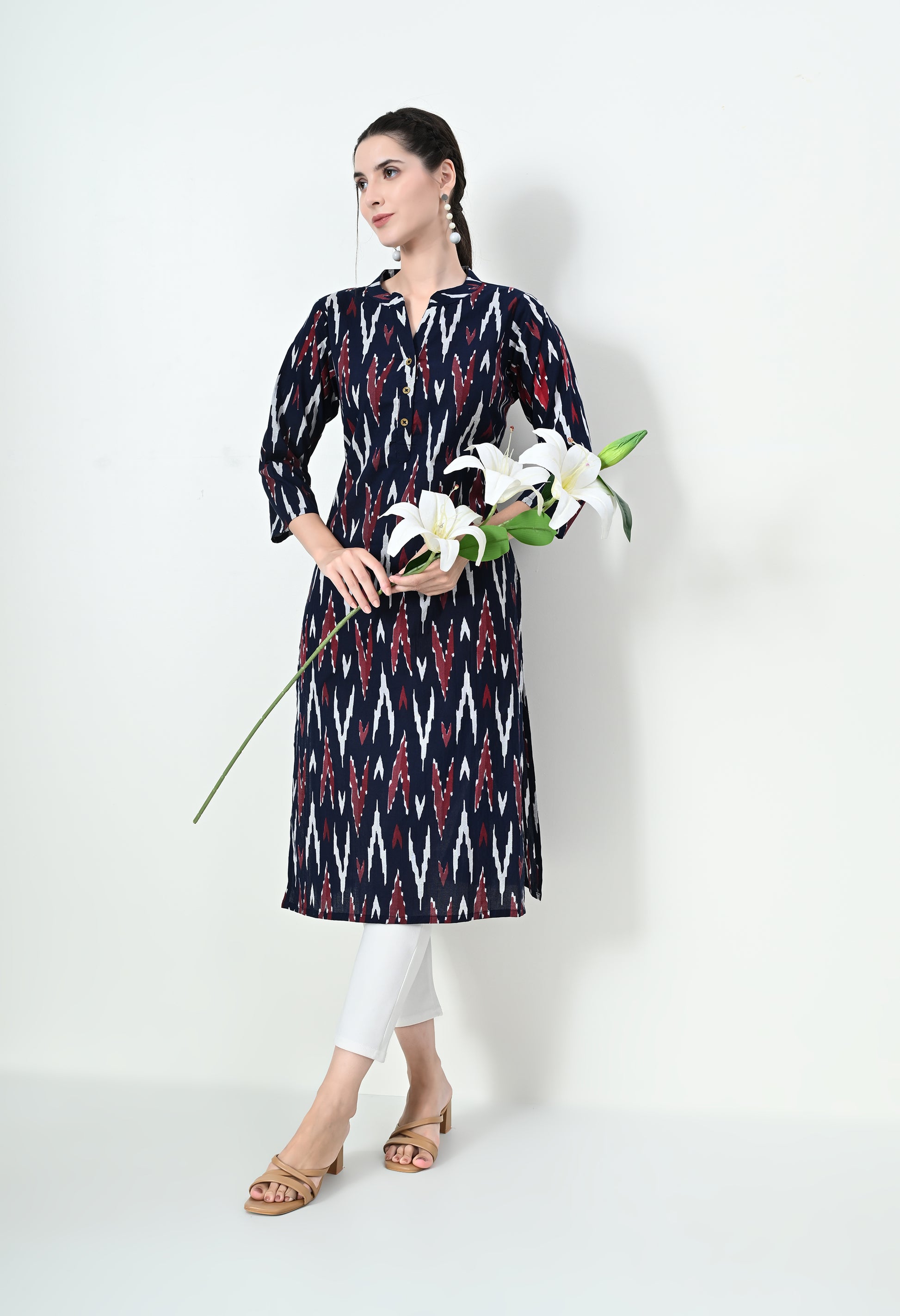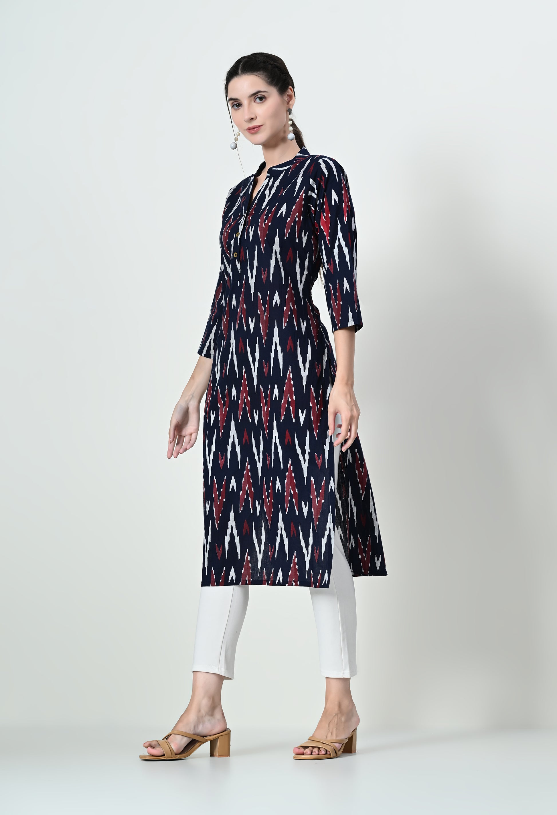 Elevate your everyday ethnic style with this pure cotton straight kurti featuring a timeless Ikat print. Designed for comfort and elegance, it comes with a classic straight silhouette, three-quarter sleeves, and a buttoned neckline—perfect for daily wear, office, or casual outings. Soft, breathable fabric ensures all-day comfort with effortless style.