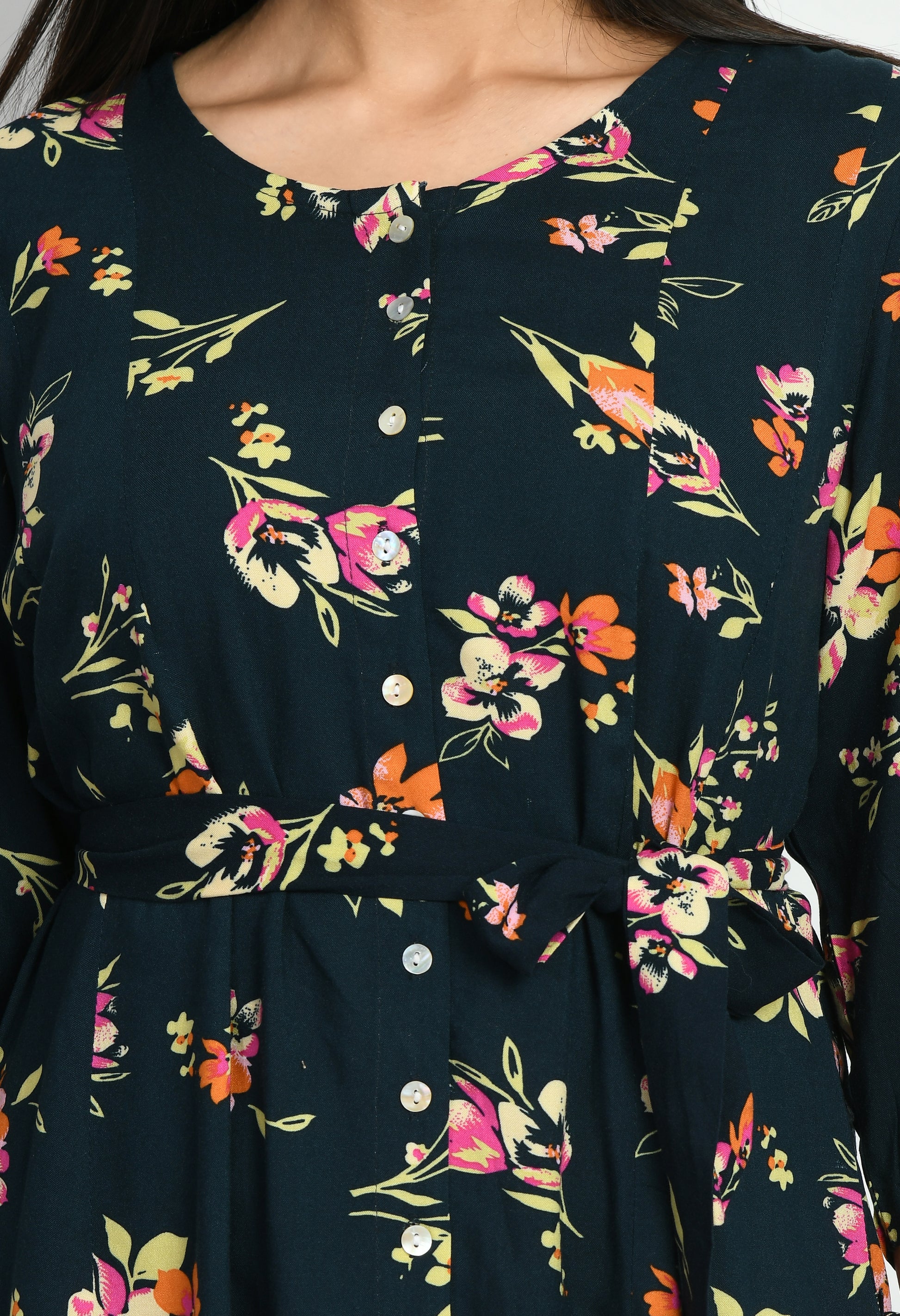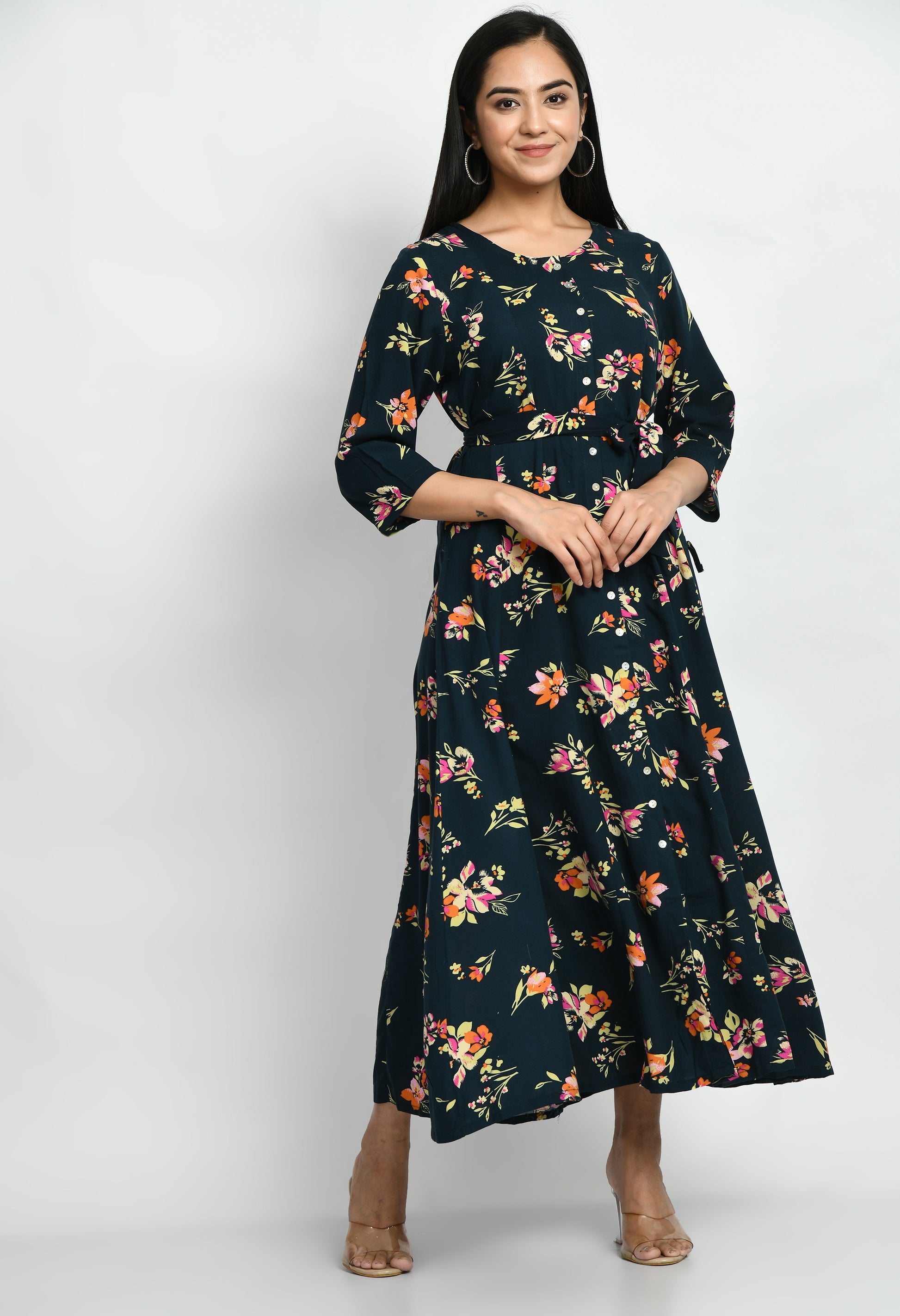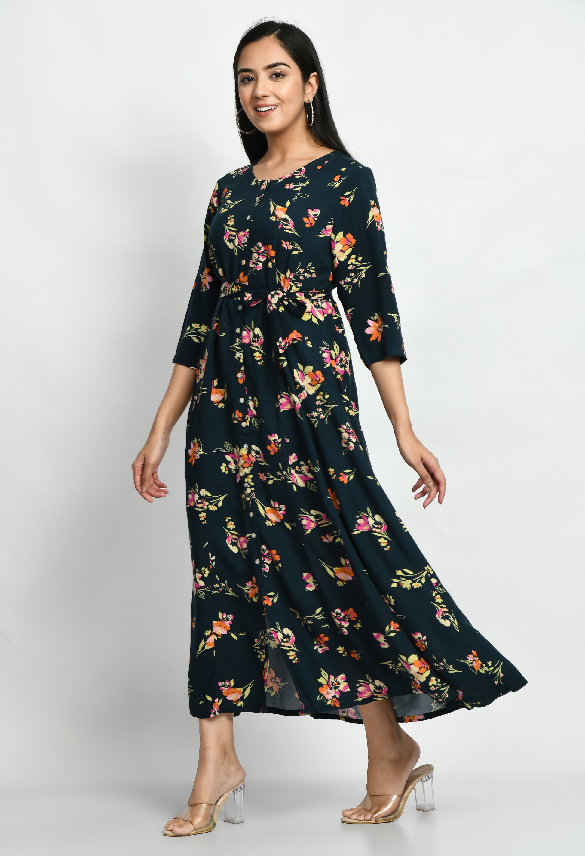 The dress features a graceful floral-inspired all-over printed pattern that adds a fresh and feminine touch. The print is balanced with a flattering A-line silhouette, creating a flowy look that suits multiple body types. Designed with three-quarter length sleeves, the dress provides comfortable coverage while maintaining a stylish appearance. The round neckline with a subtle button-front detail enhances the overall design, while the waist tie-up accent adds shape and definition to the fit.