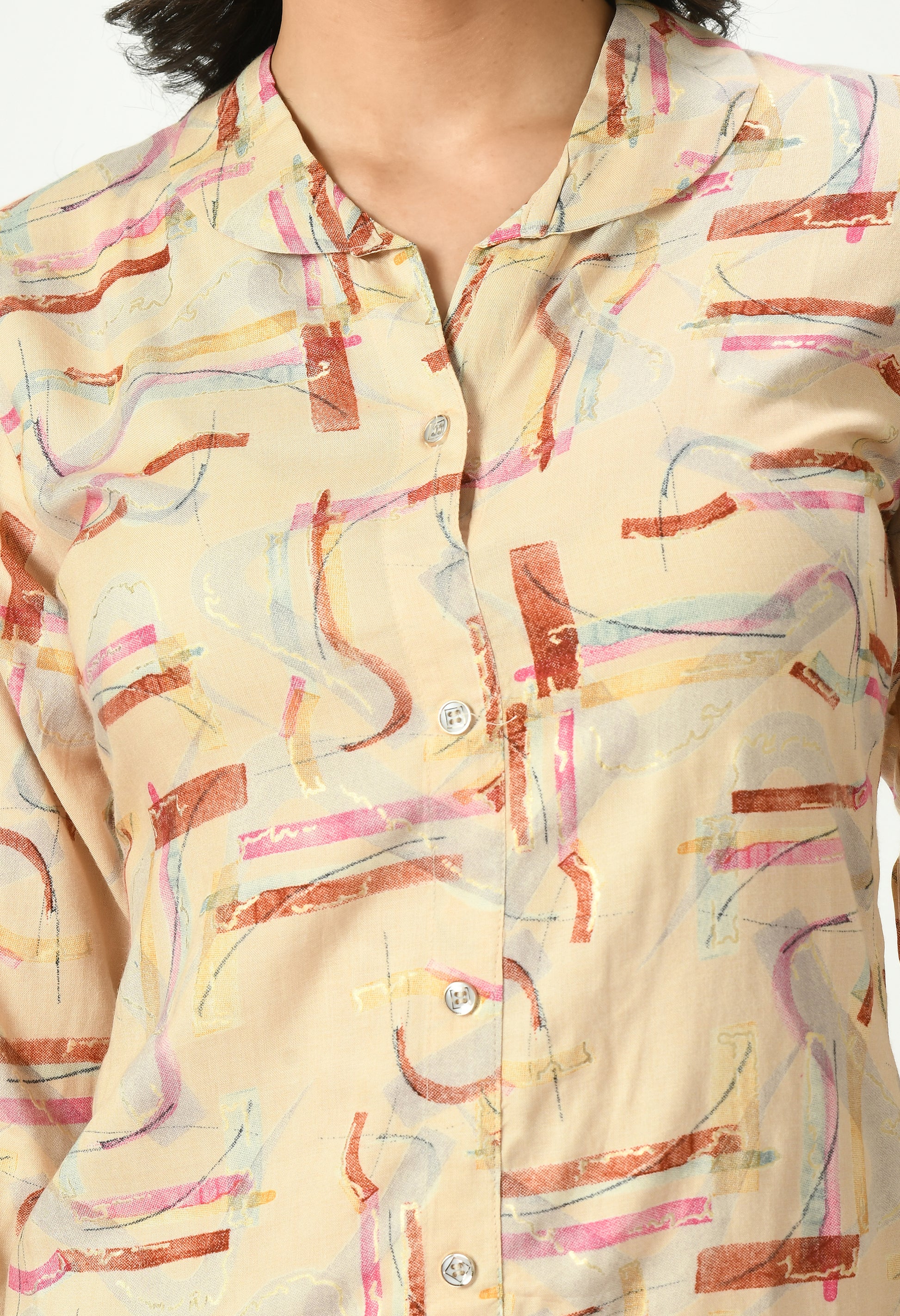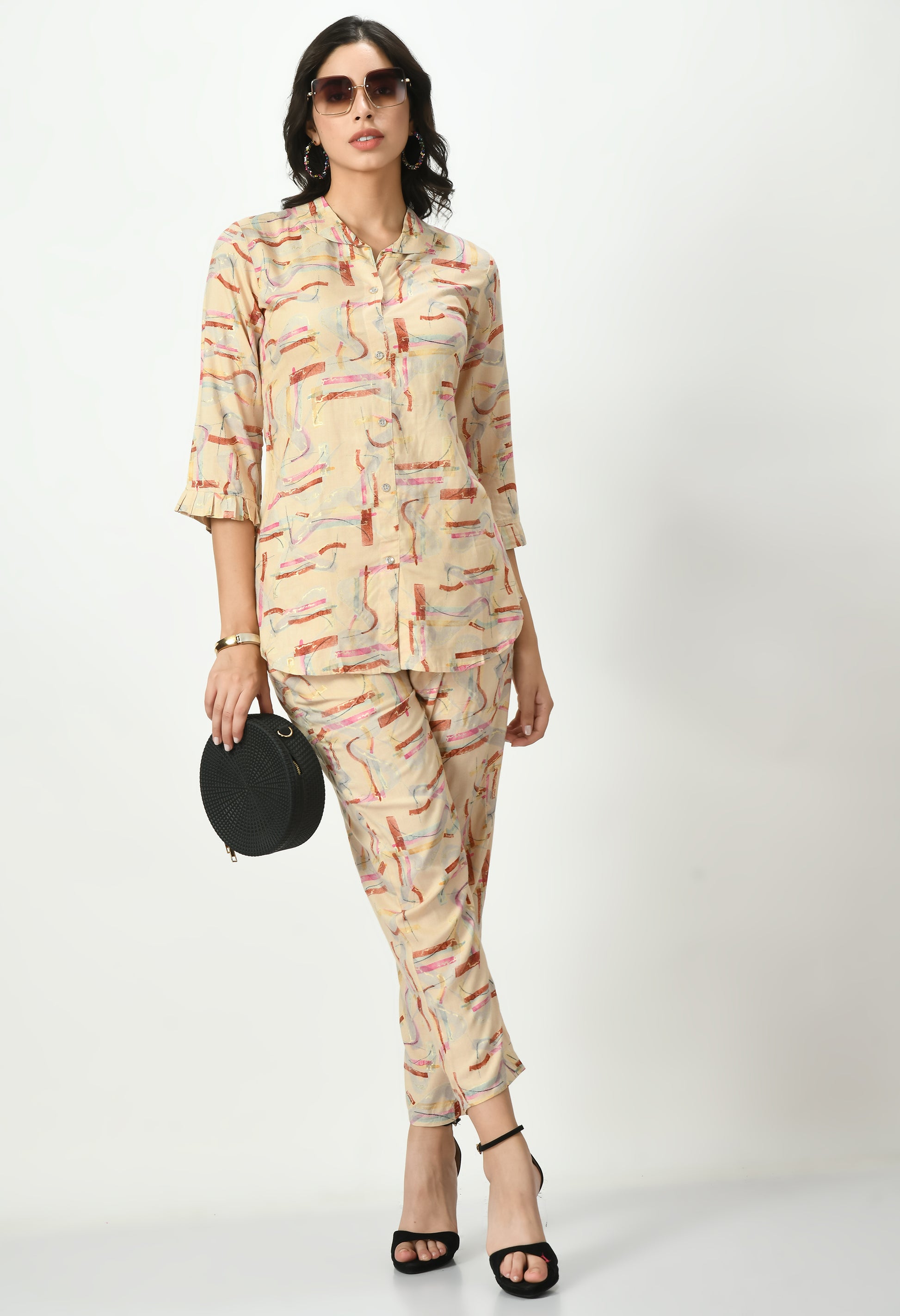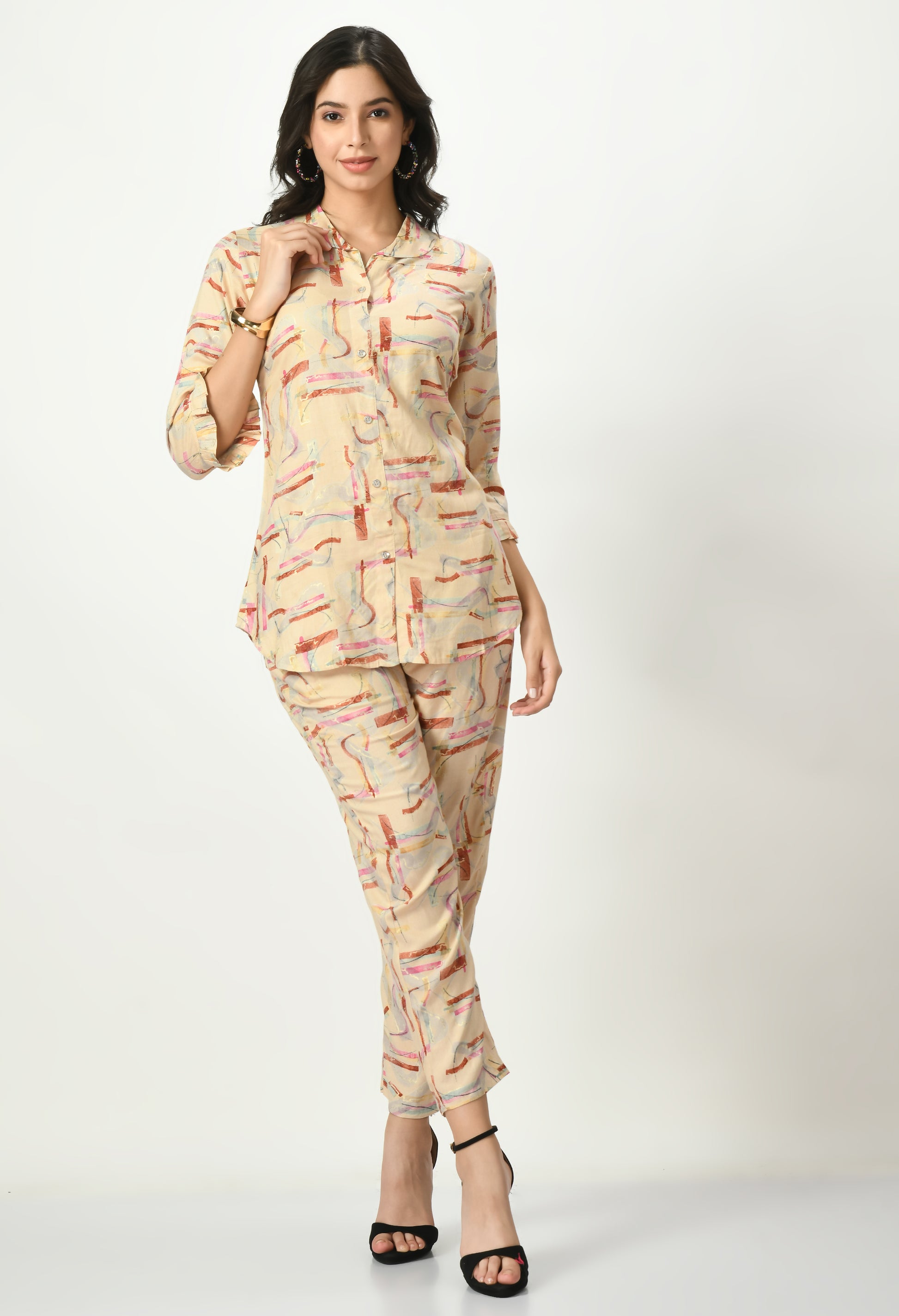 The top features an abstract-inspired pattern highlighted with a subtle all-over printed design, offering a modern and minimal appeal. Styled with a shirt-style neckline and three-quarter sleeves finished with a soft cuff, it provides a clean and versatile silhouette. The matching pants follow the same coordinated print, creating a balanced and effortlessly stylish outfit. The lightweight rayon fabric ensures smooth drape and all-day comfort.