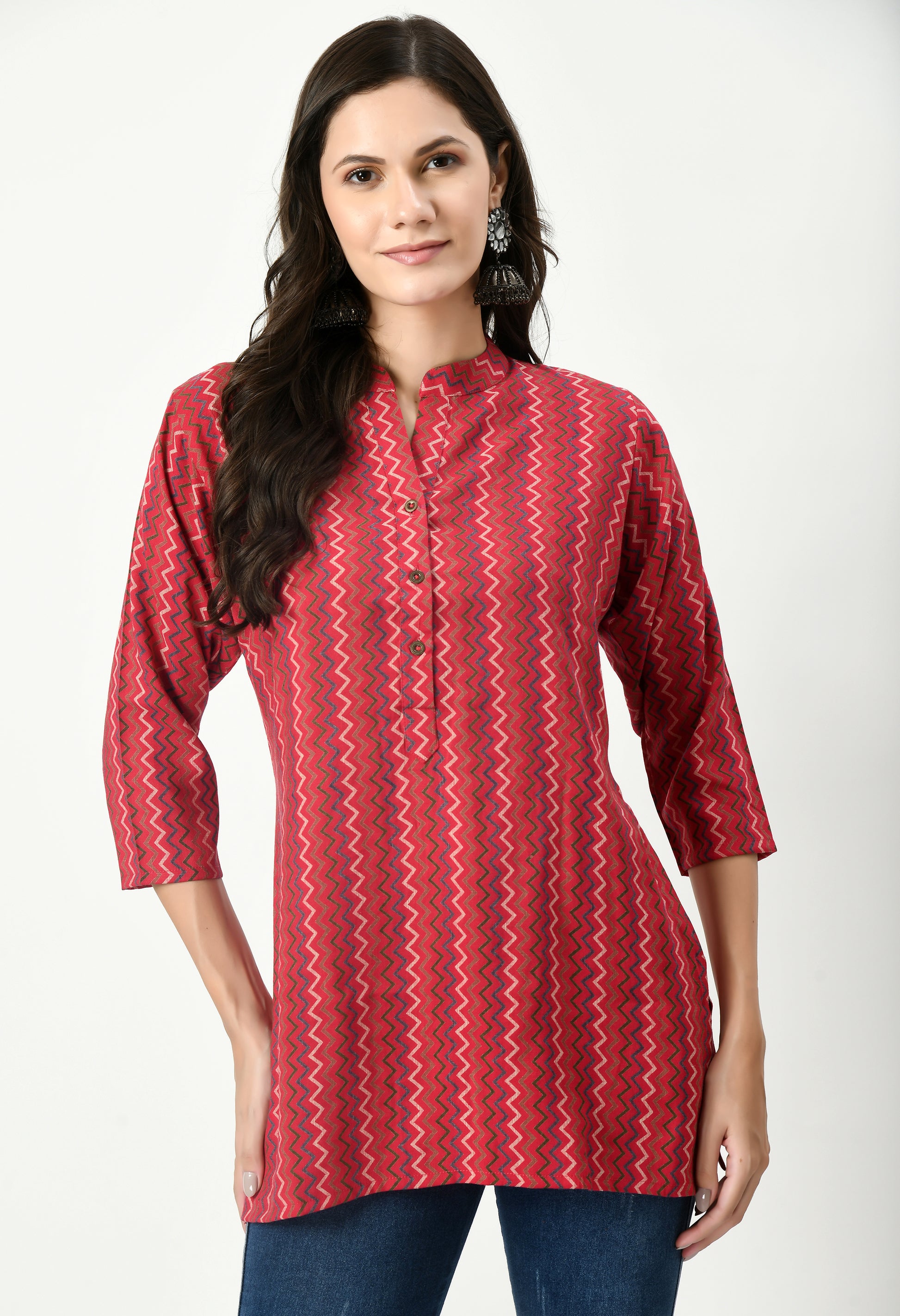 This top features an all-over zigzag printed pattern that adds a modern ethnic touch and enhances its visual appeal. Designed with a smart mandarin-style neckline and a front button placket, it delivers a clean, structured look suitable for both casual and semi-formal settings.