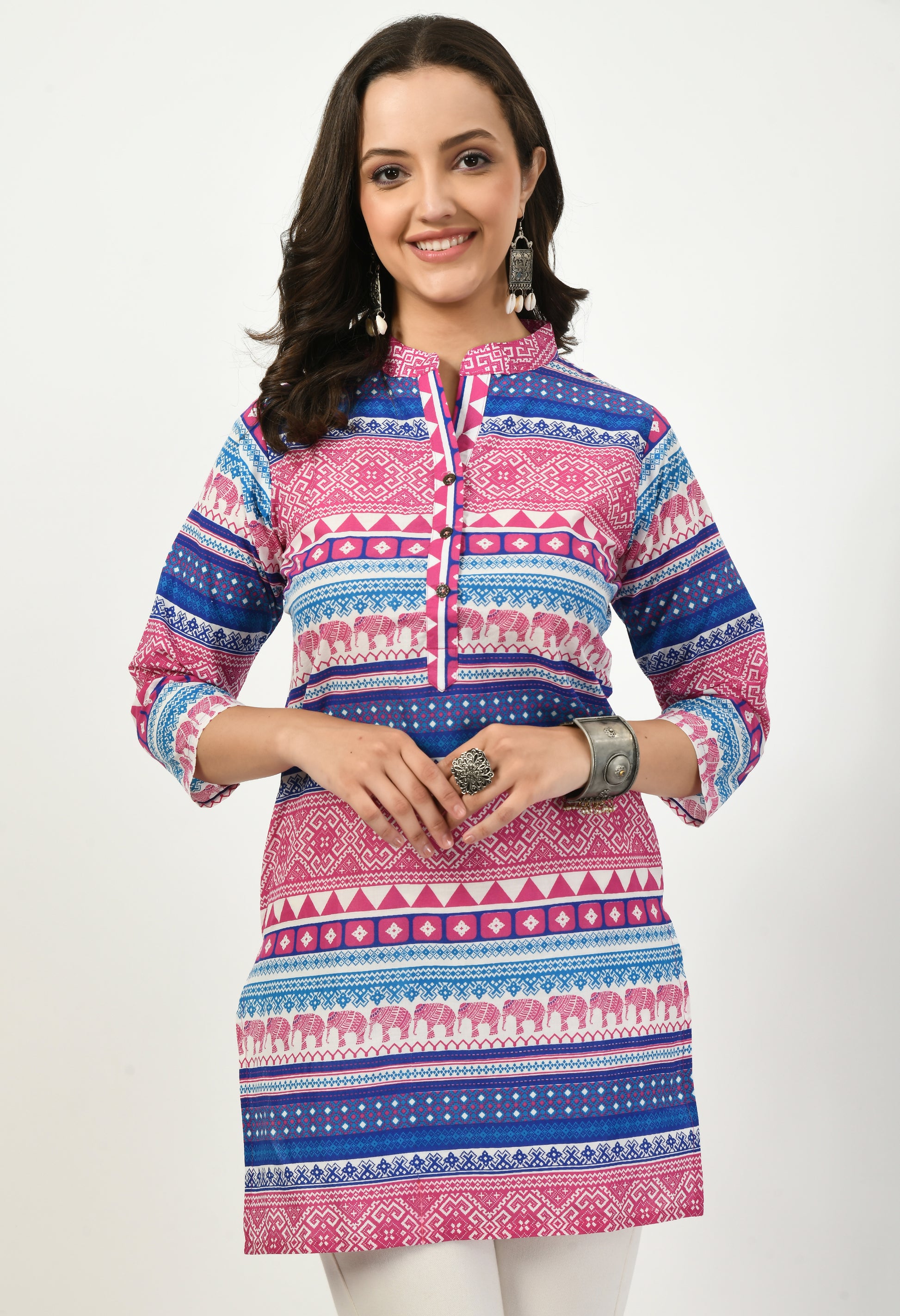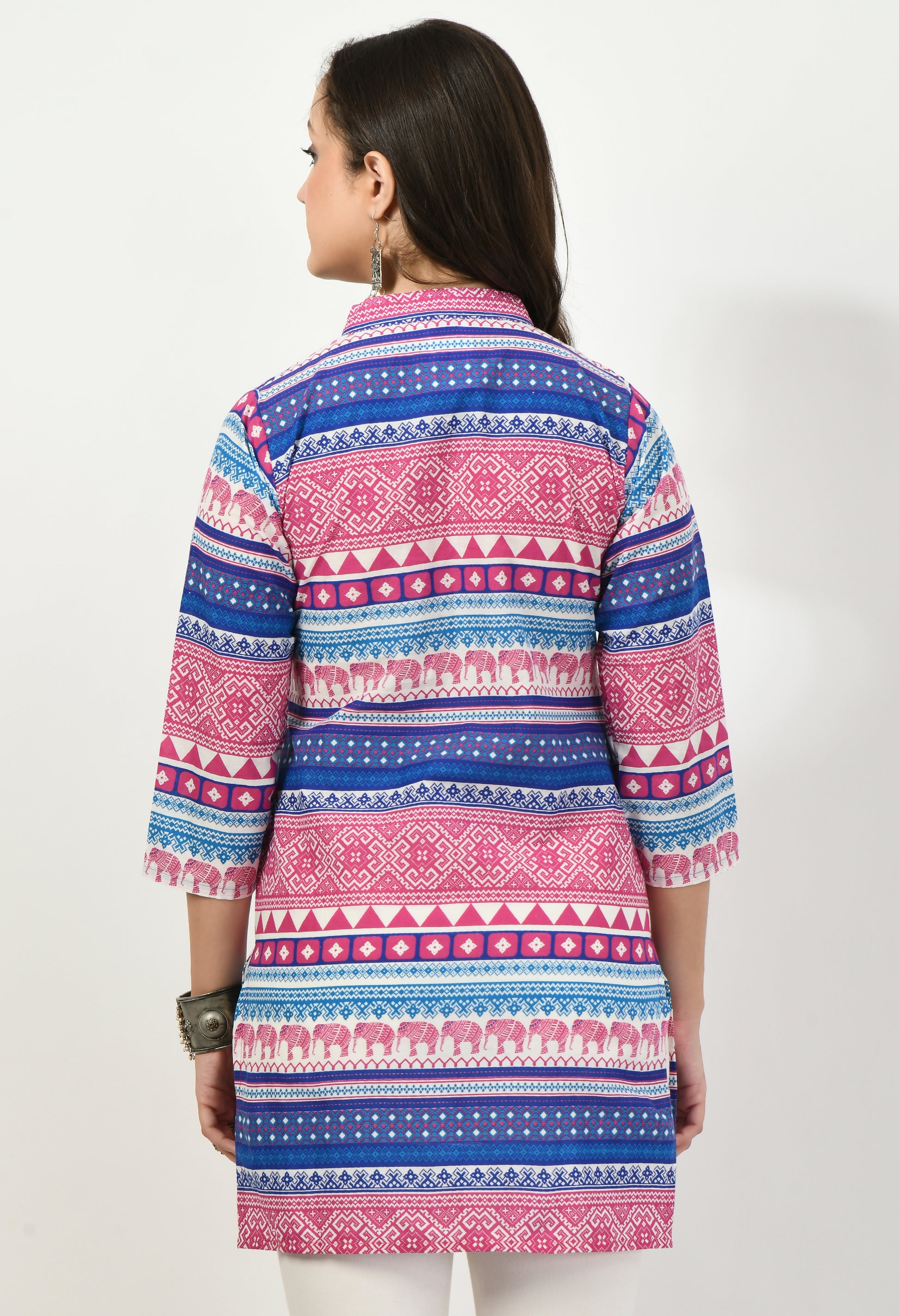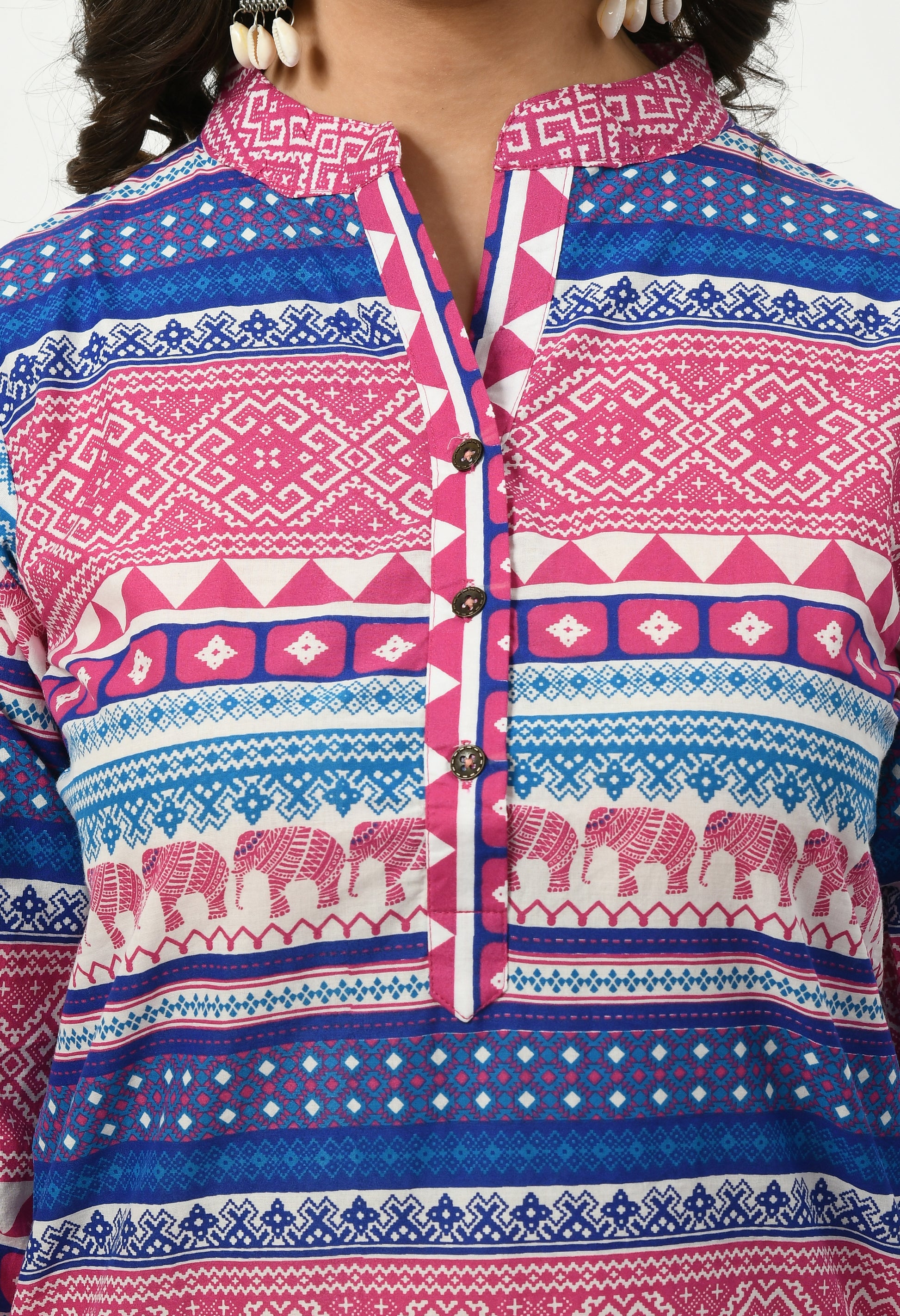 This top features an attractive all-over ethnic-inspired print with geometric and motif detailing, creating a rich and eye-catching look. Designed with a smart mandarin collar neckline and a short front button placket, it offers a structured yet relaxed appeal that works well for both casual and work-ready styling.