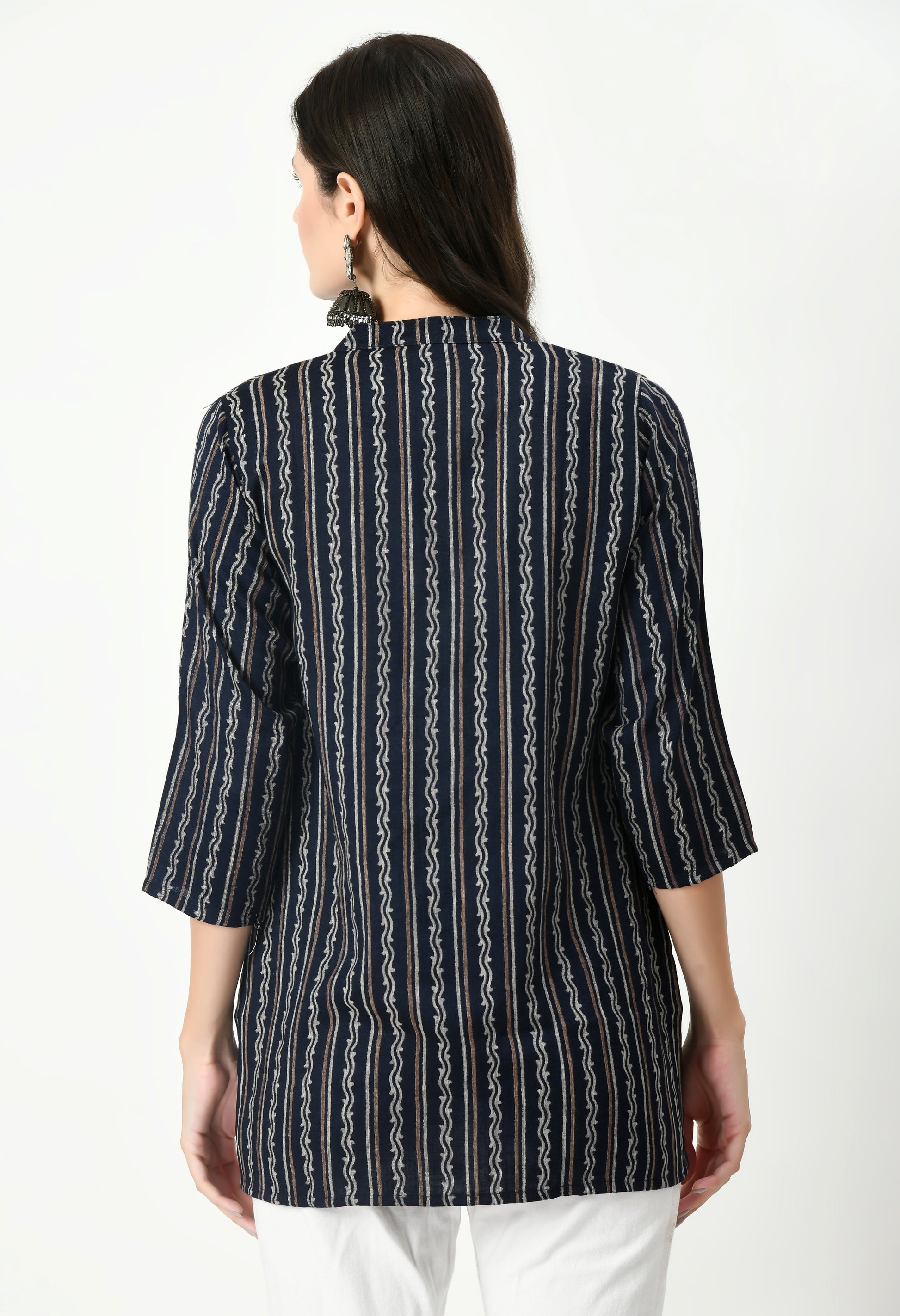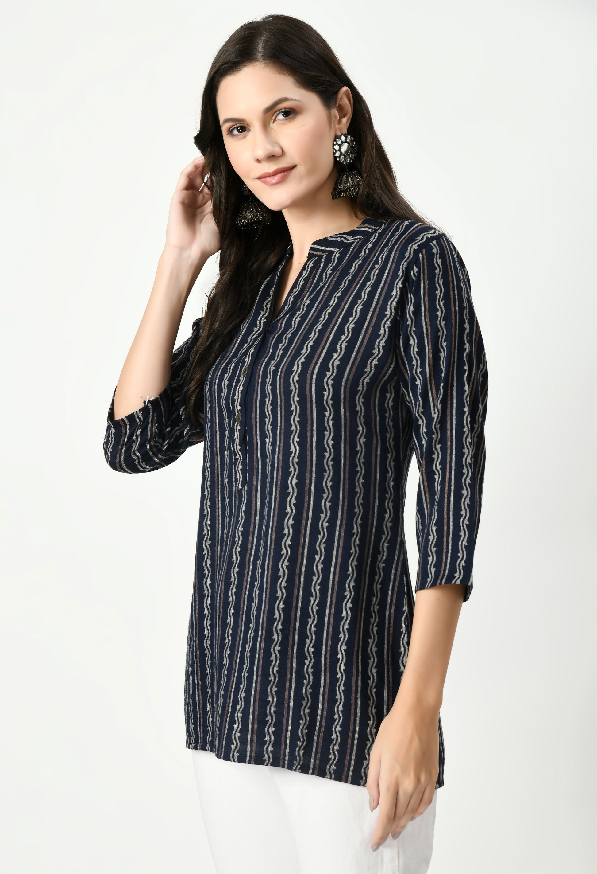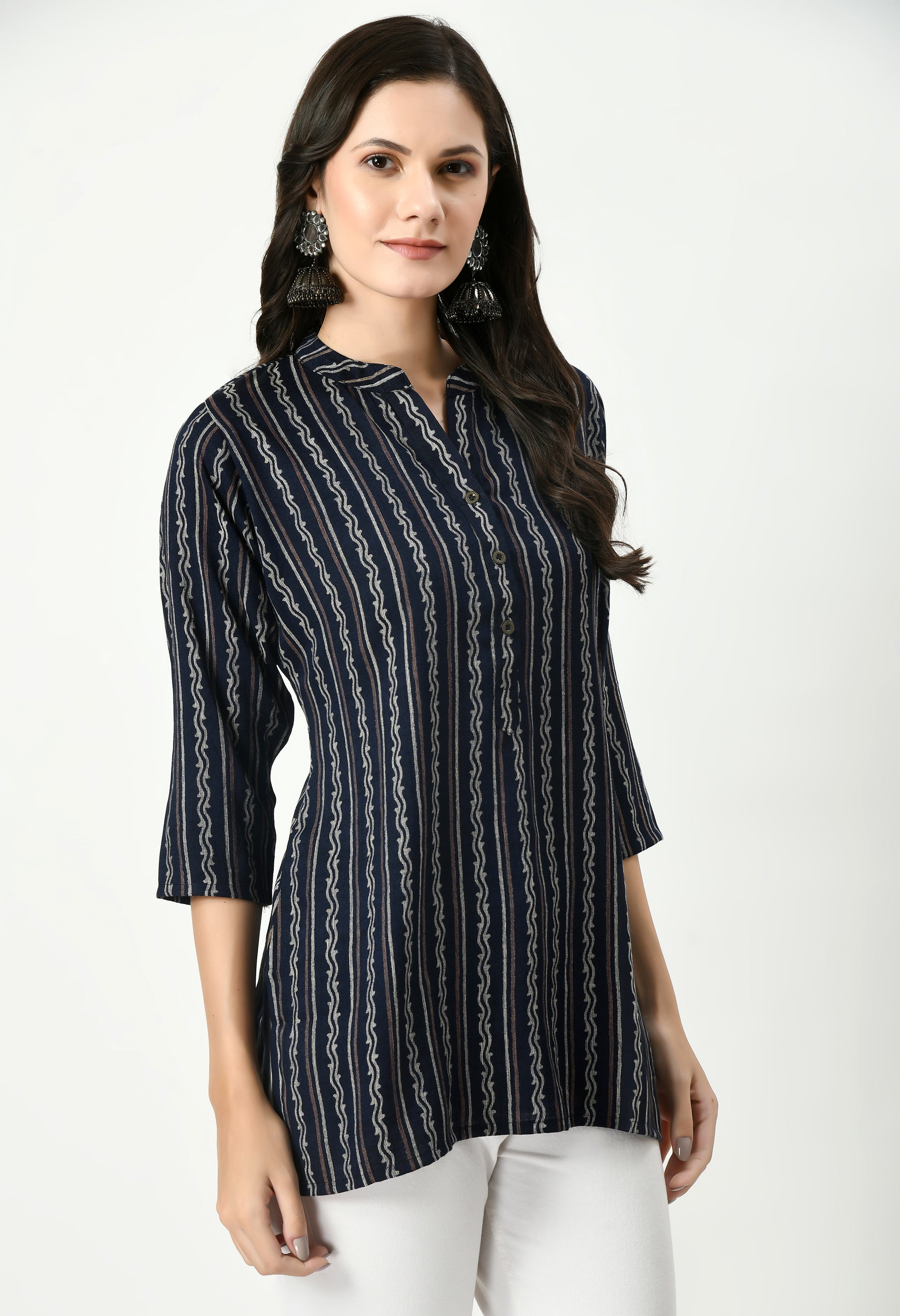 This top features an all-over zigzag printed pattern that adds a modern ethnic touch and enhances its visual appeal. Designed with a smart mandarin-style neckline and a front button placket, it delivers a clean, structured look suitable for both casual and semi-formal settings.