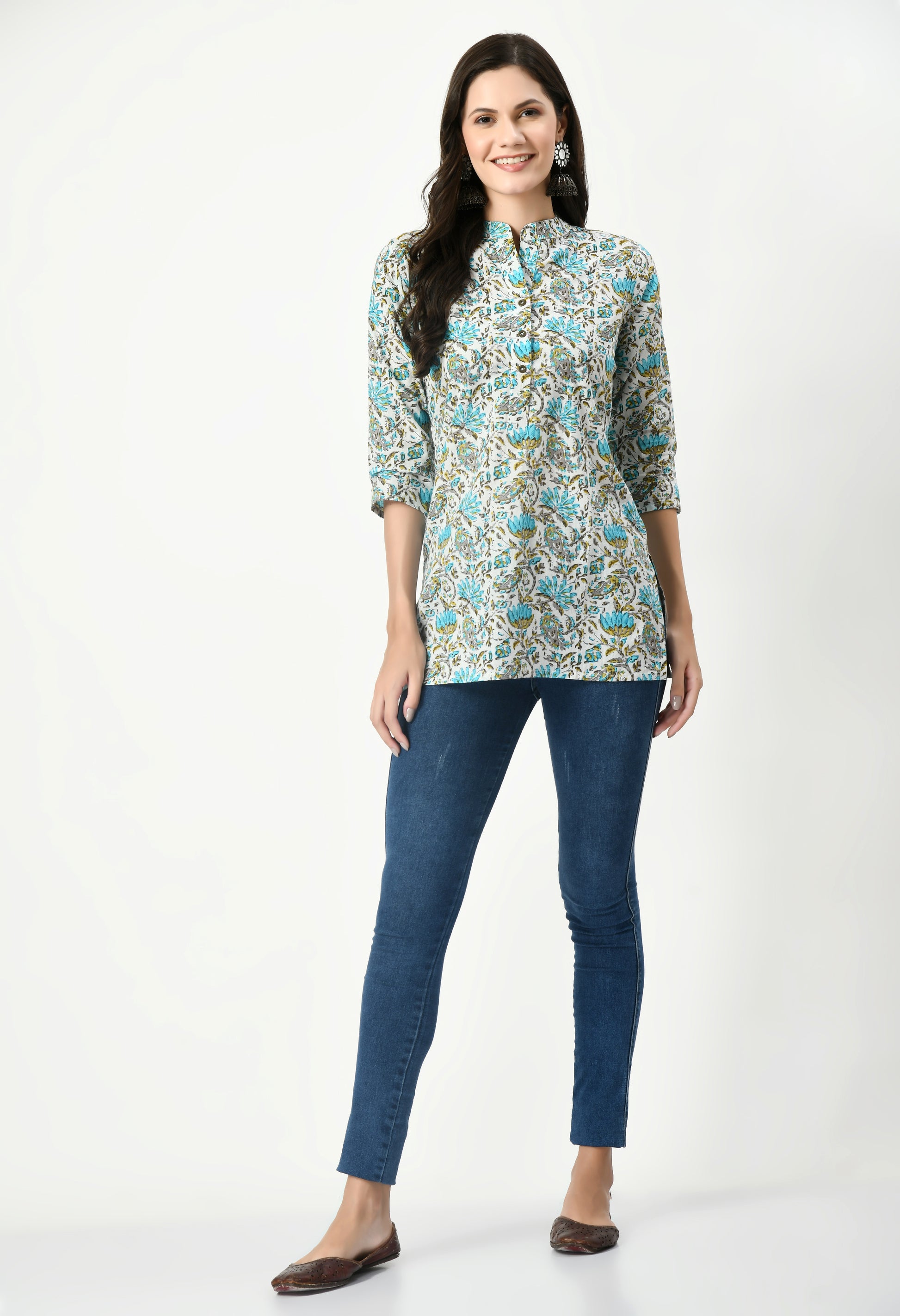 This top features a graceful all-over floral print that adds a fresh and timeless appeal. The mandarin collar neckline with a short front button placket enhances the overall look with a touch of structured elegance, making it suitable for both casual and semi-formal occasions.