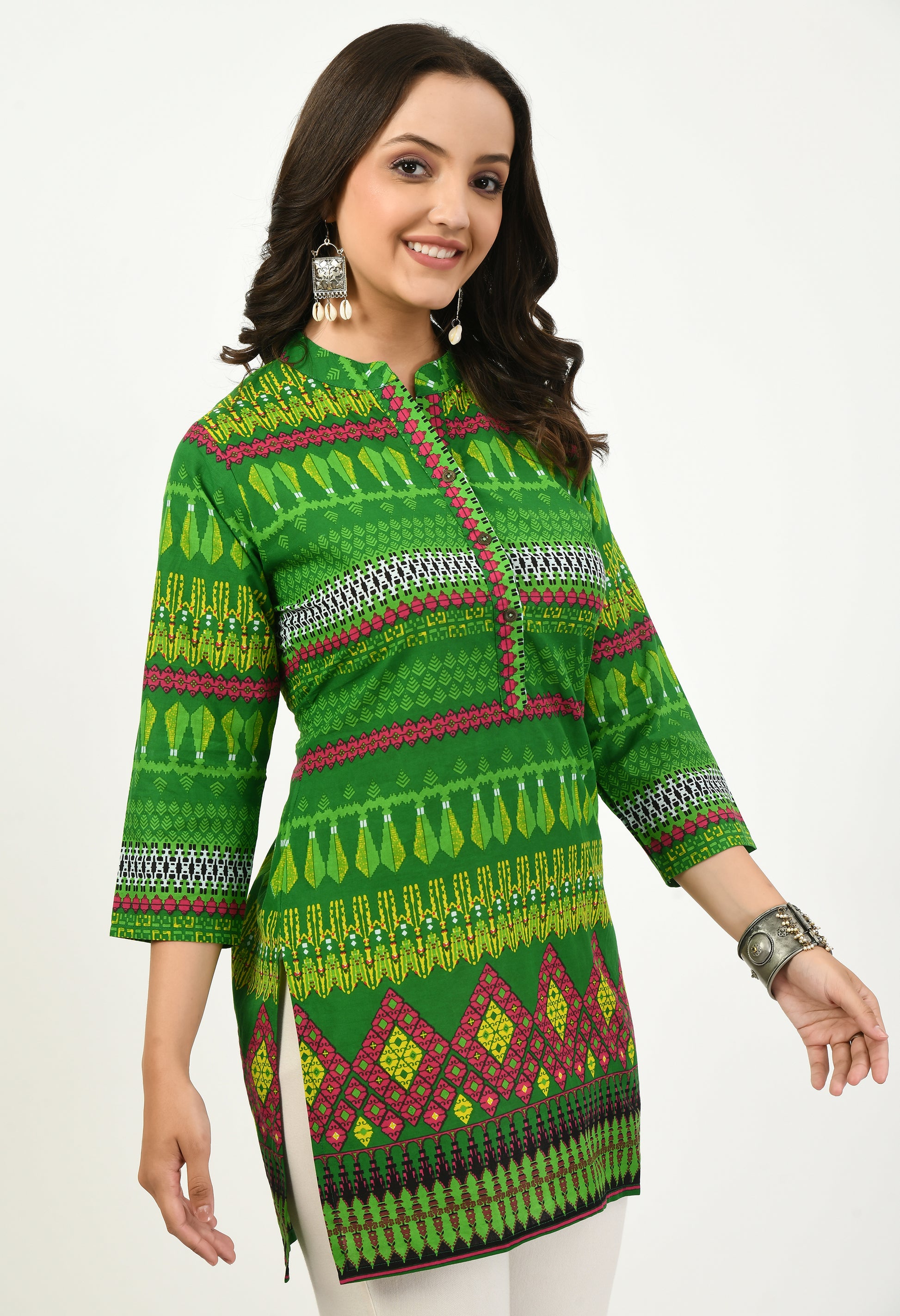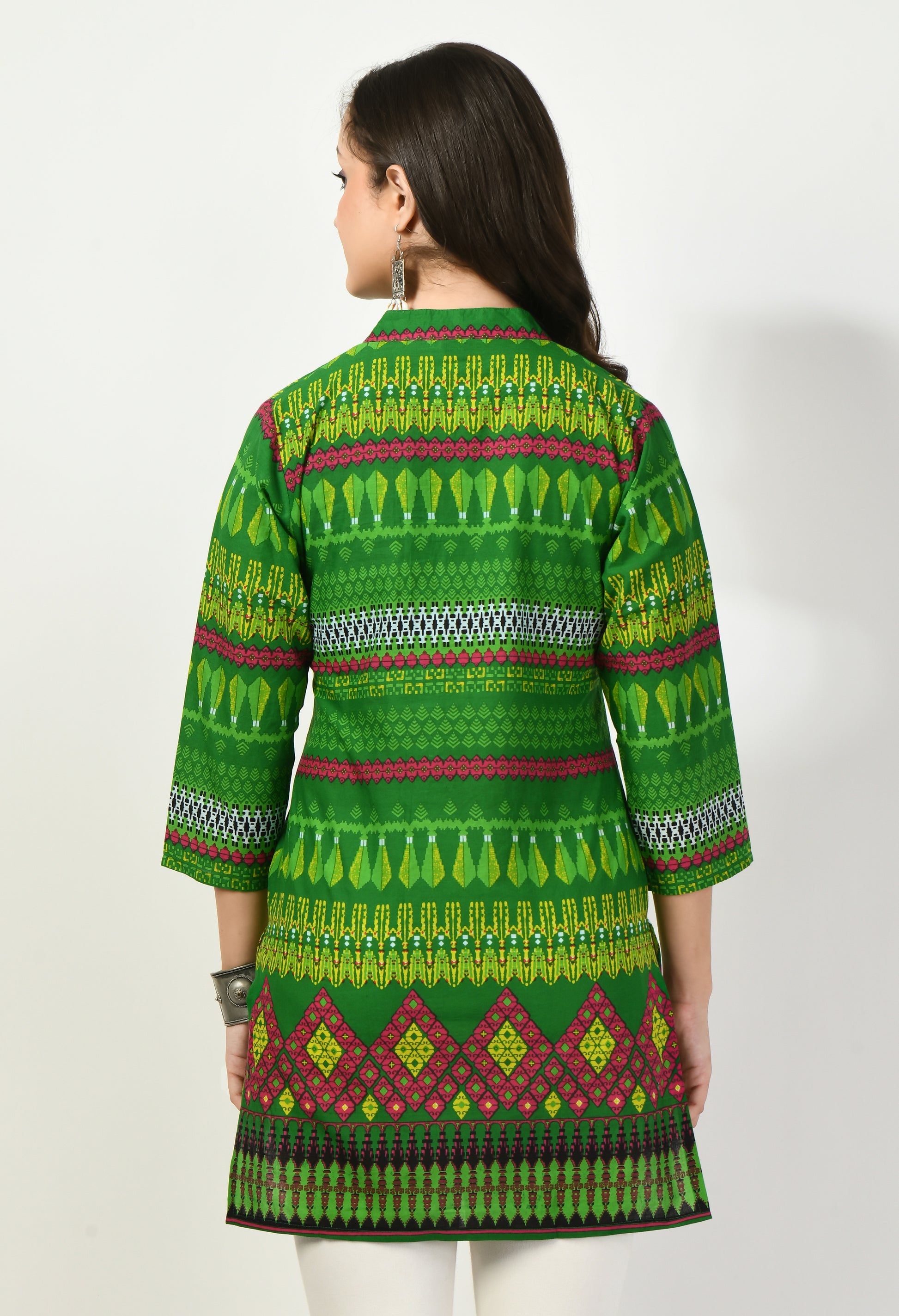 This top features an attractive all-over ethnic-inspired print with geometric and motif detailing, creating a rich and eye-catching look. Designed with a smart mandarin collar neckline and a short front button placket, it offers a structured yet relaxed appeal that works well for both casual and work-ready styling.