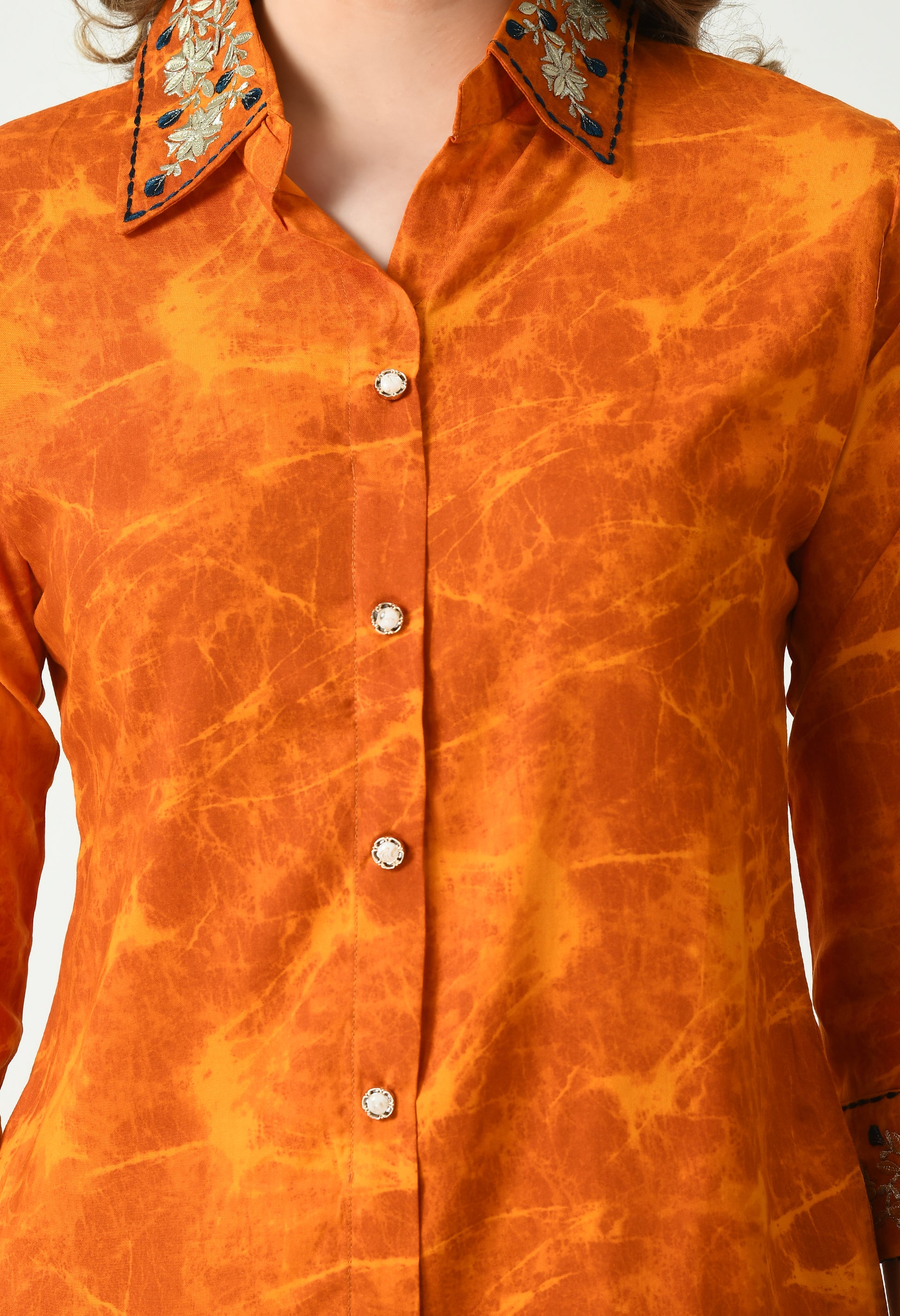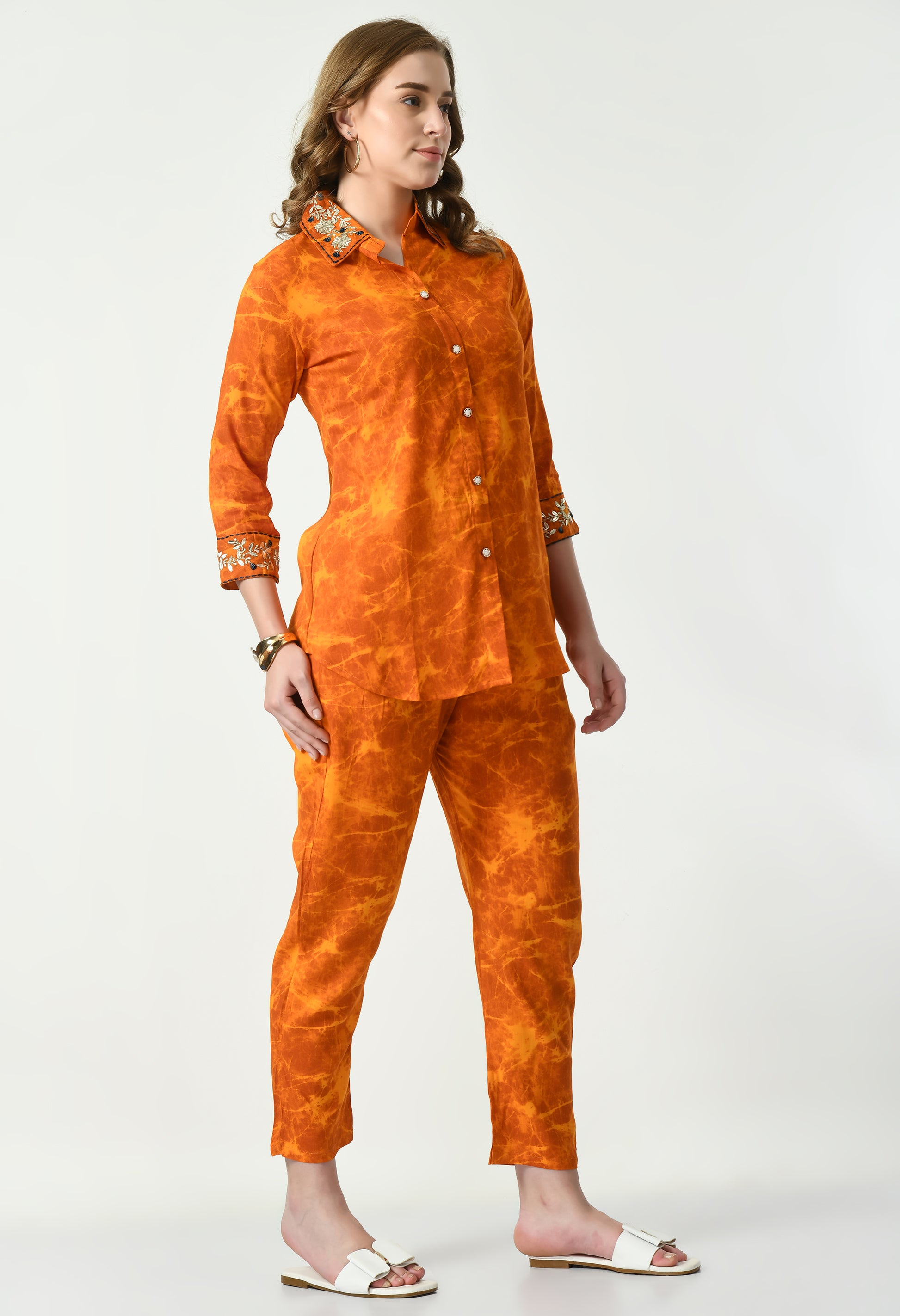 The top showcases a subtle abstract marble-inspired pattern with a smooth all-over printed finish that gives the outfit a refined and contemporary look. Designed with a shirt-style collar and front button closure, it adds structure while remaining comfortable. The three-quarter sleeves feature delicate embroidered detailing at the cuffs, enhancing the overall design with a touch of sophistication. The matching straight-fit pants mirror the same print, offering a clean and cohesive appearance.
