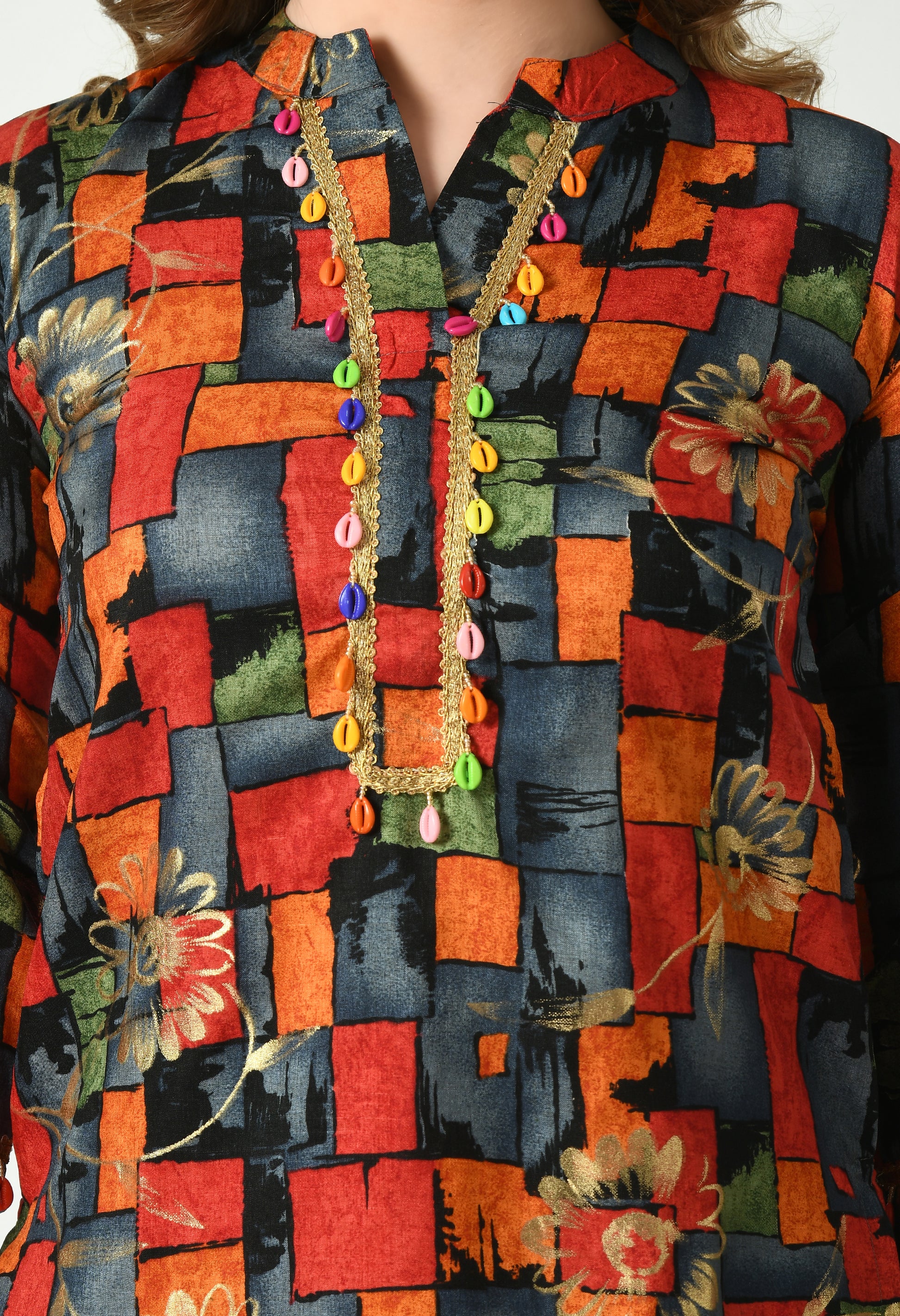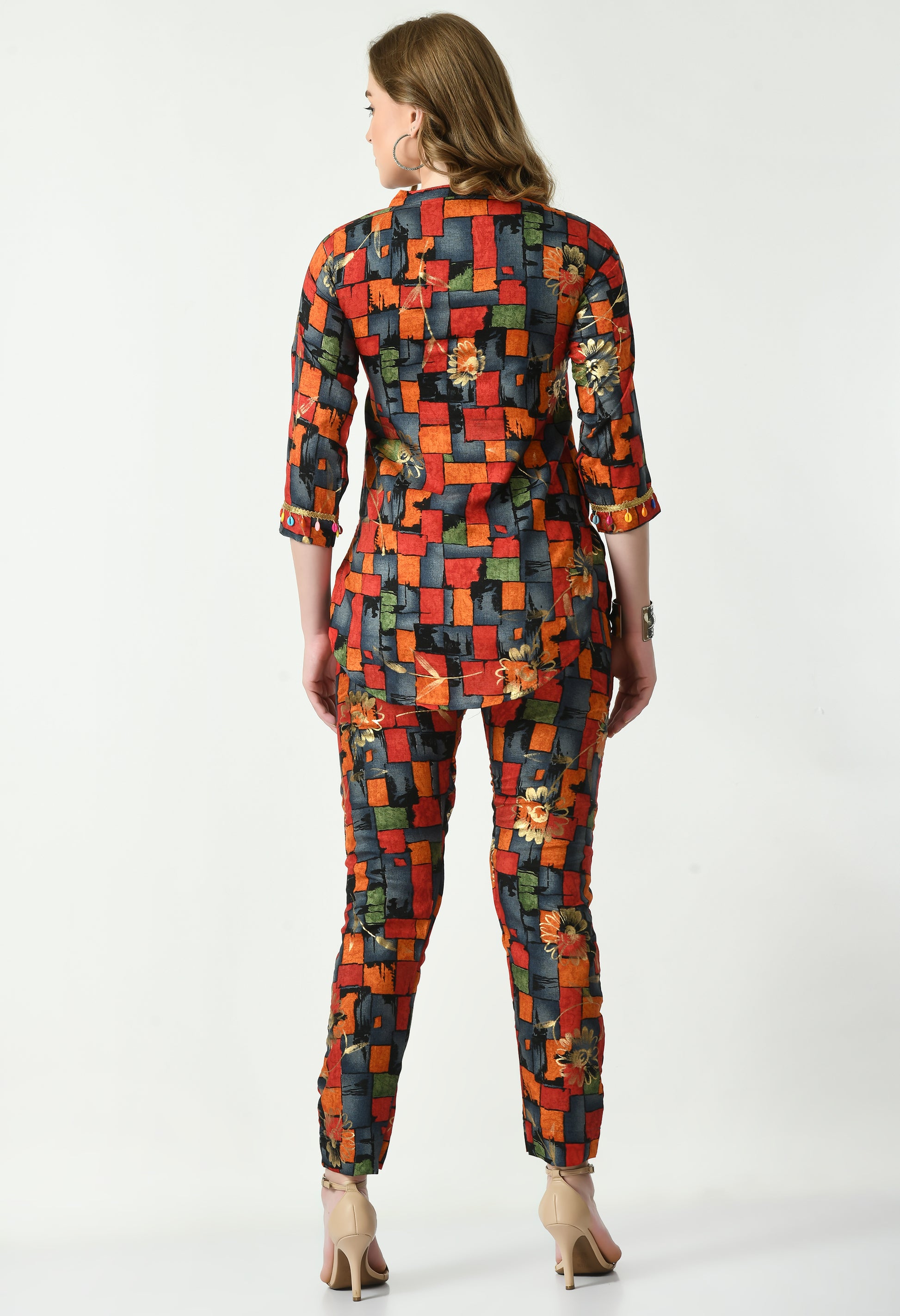 The top is styled with a tasteful all-over printed pattern, offering a subtle yet eye-catching look suitable for both casual and semi-dressy occasions. Designed with a classic neckline and front detailing, it enhances the overall silhouette without compromising comfort. The three-quarter sleeves are finished with clean cuffs, providing ease of movement and a well-balanced fit. The matching bottoms feature a straight and relaxed fit, continuing the same print to create a cohesive and coordinated look.