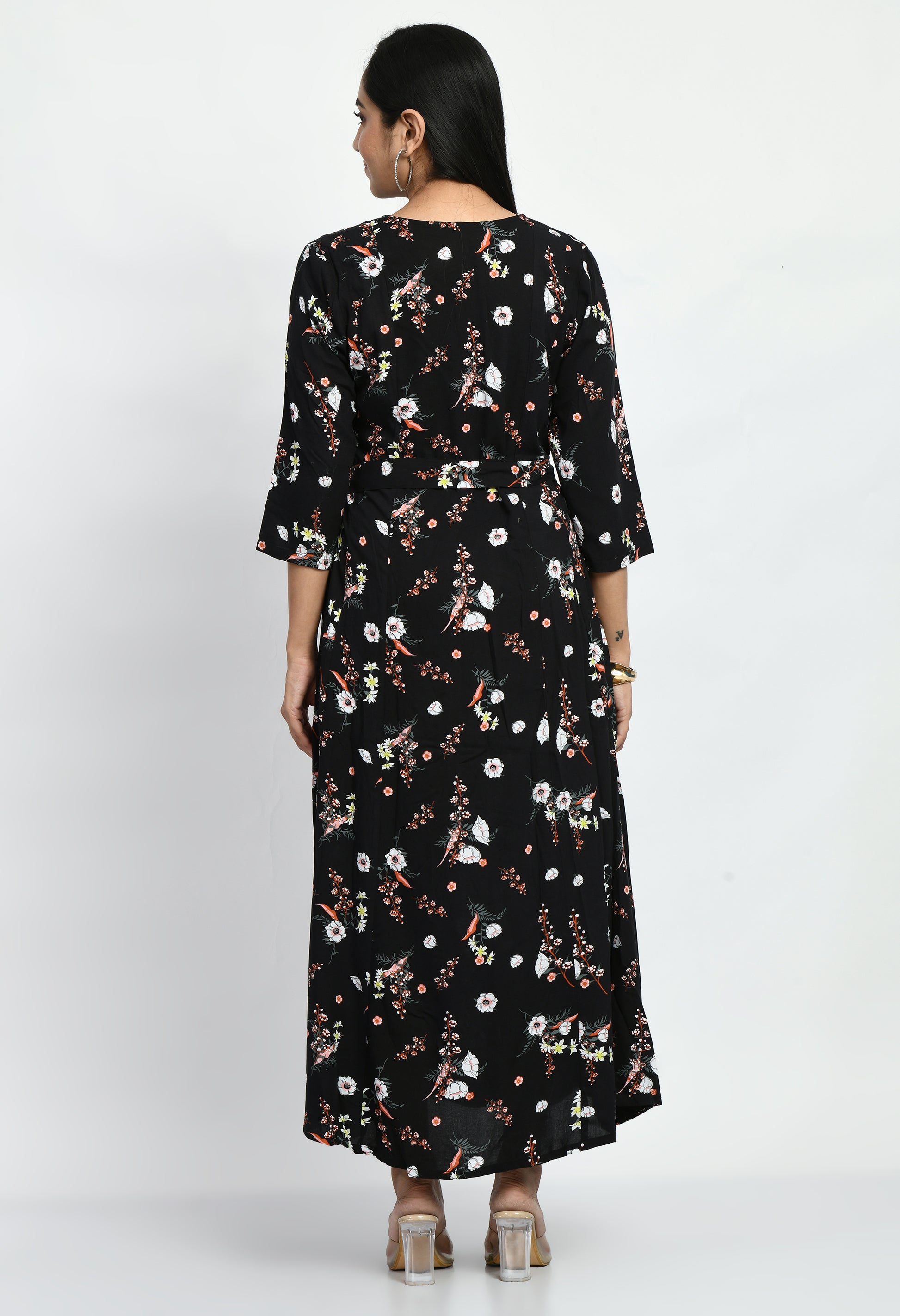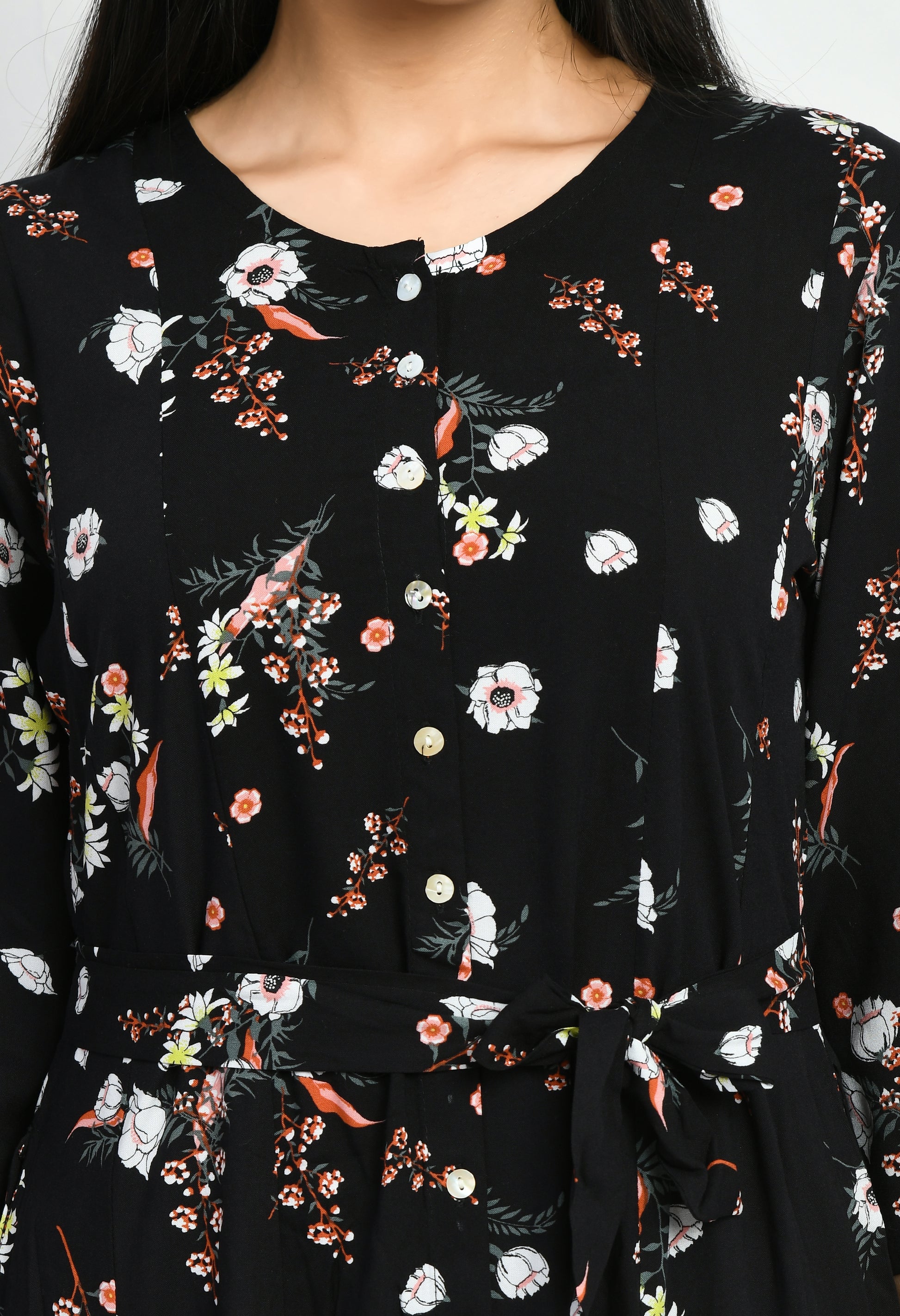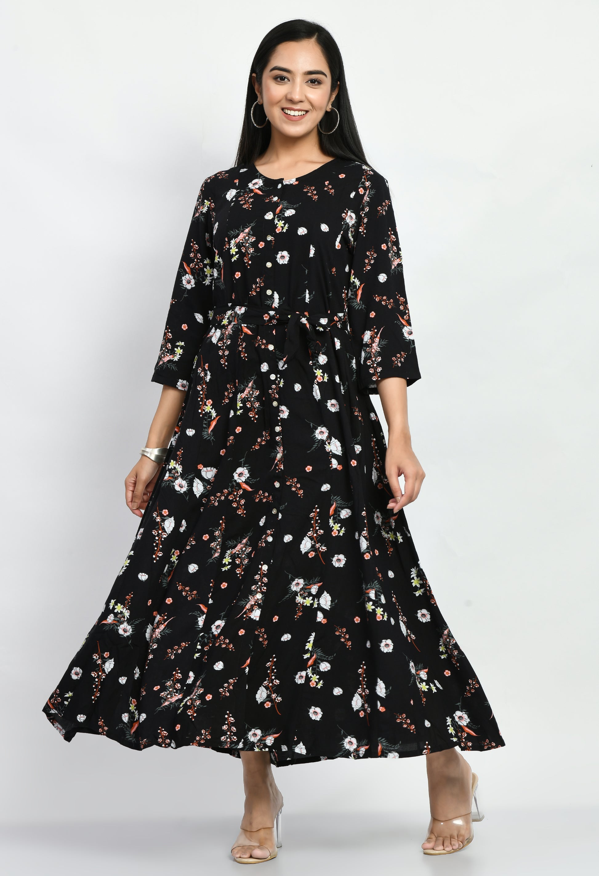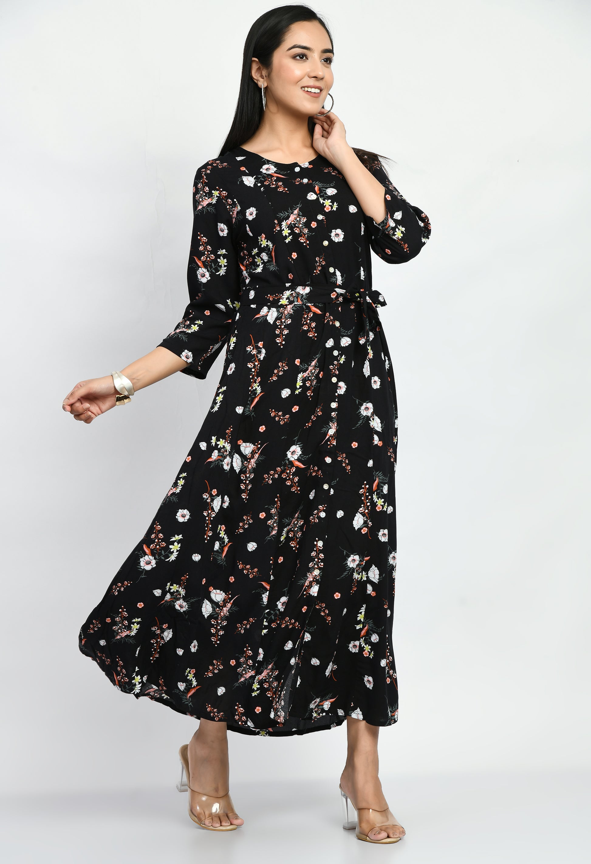 The dress showcases a refined all-over printed pattern with abstract-inspired motifs, adding subtle visual interest while maintaining an elegant look. The A-line silhouette ensures a flattering and flowy fit, allowing free movement and enhanced comfort. Styled with half-length sleeves, the dress provides balanced coverage suitable for multiple seasons. A round neckline with front button detailing adds a clean, minimal finish to the overall design.