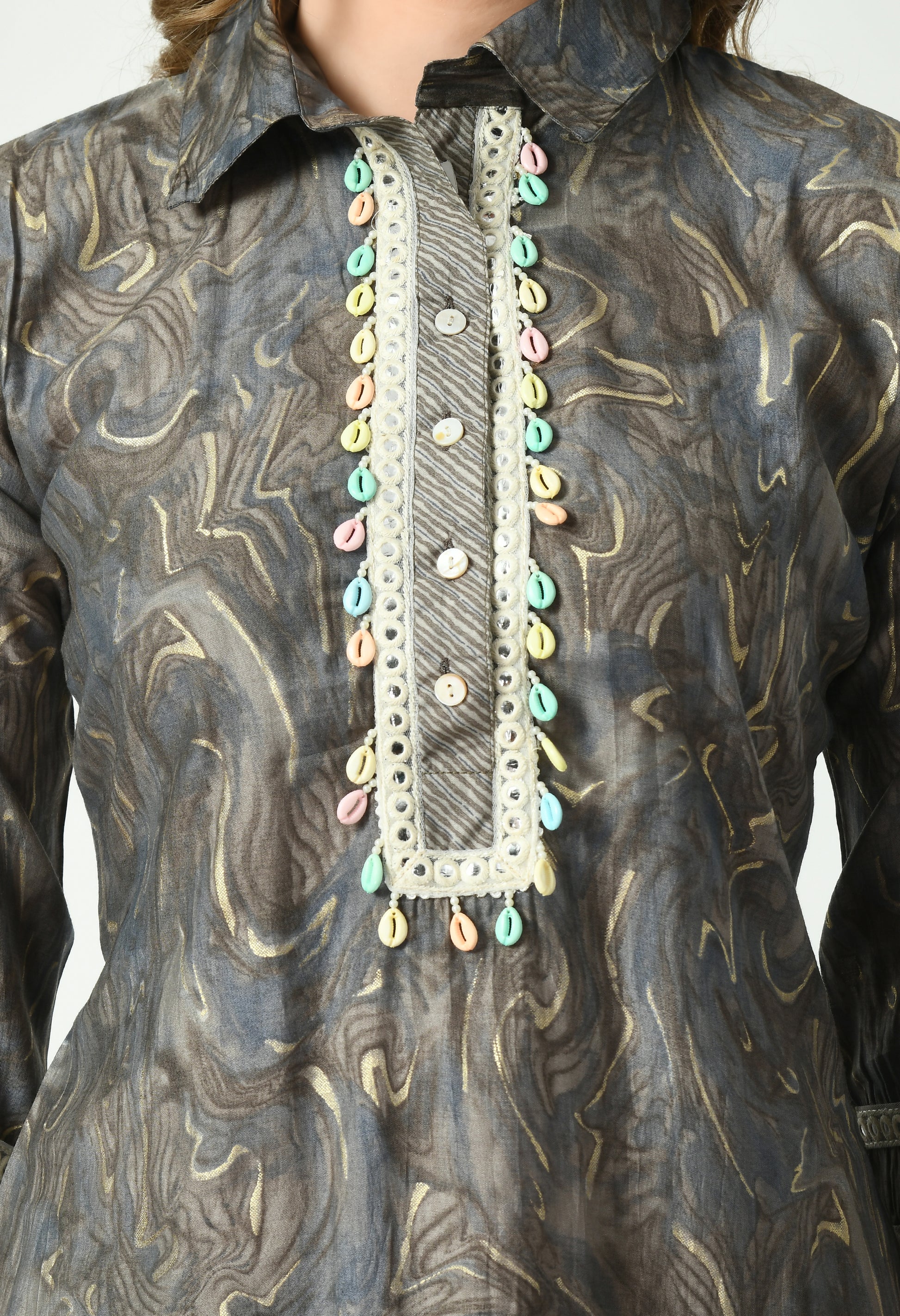 It comes with 3/4 sleeves finished with mirror lace for an elegant finish. The matching bottom includes two side pockets for convenience and mirror lace detailing at the hem, enhancing the overall style.