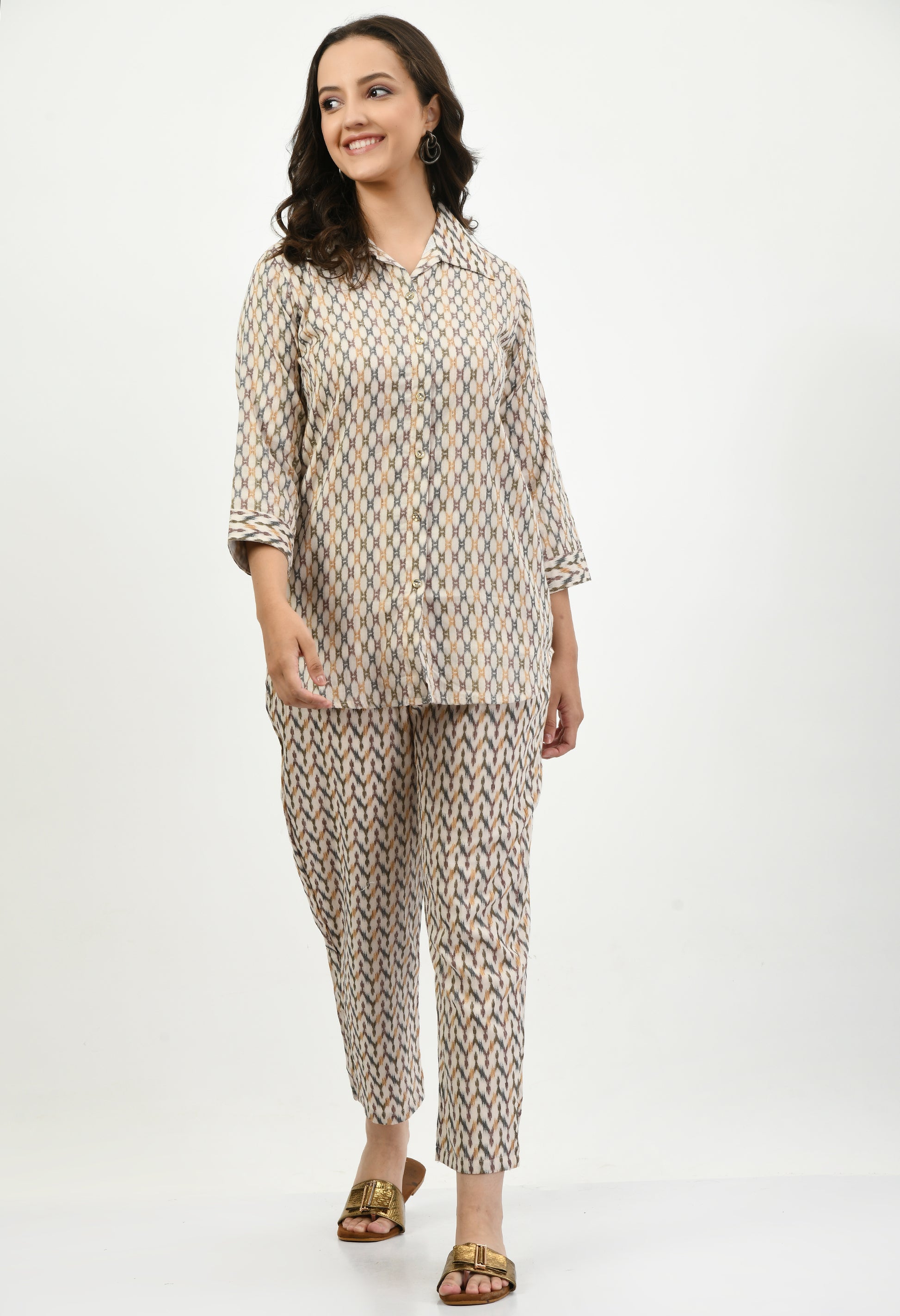 This women’s co-ord set is made from soft rayon fabric that feels light and comfortable on the skin. It includes a printed shirt-style top with 3/4 sleeves and matching straight-fit pants.