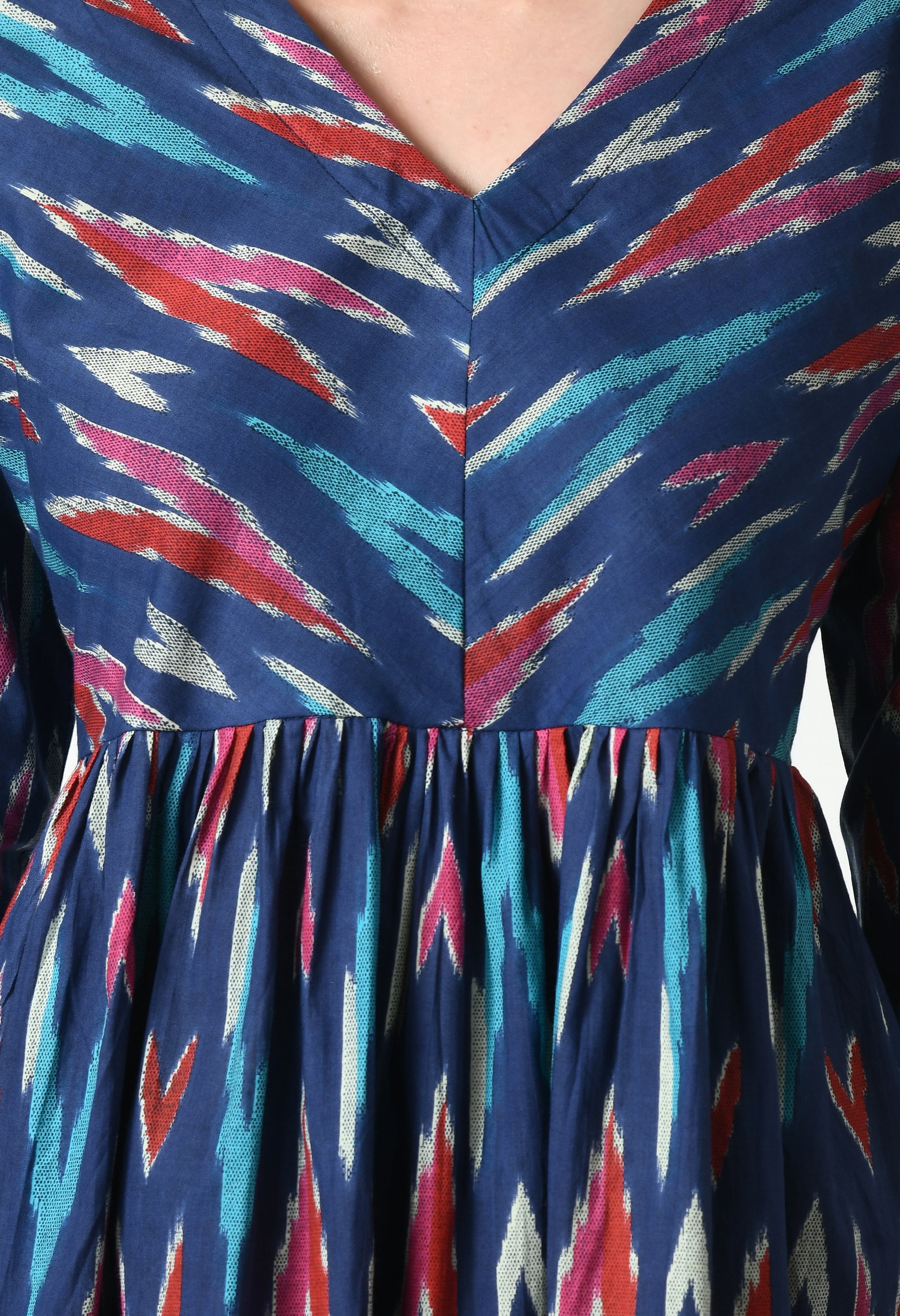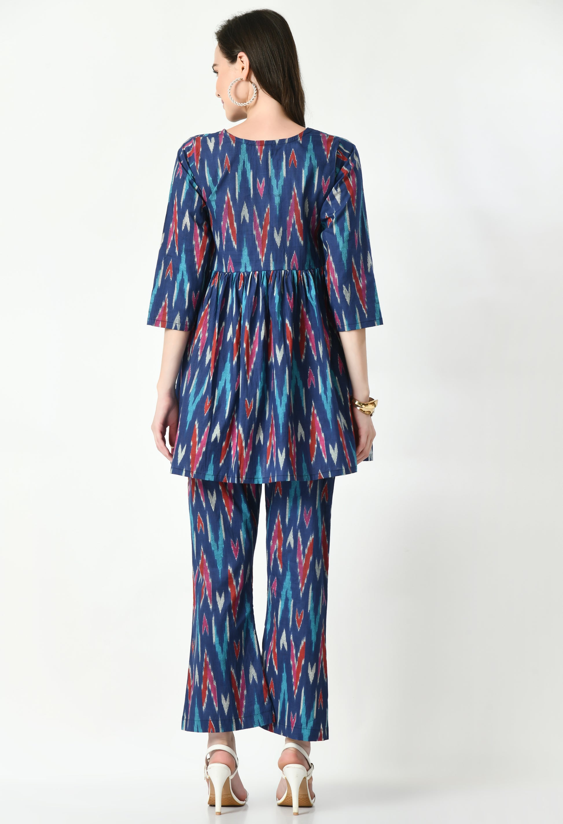 Upgrade your everyday wardrobe with this women’s pure cotton co-ord set, designed for comfort with a stylish touch. Crafted from breathable and lightweight cotton fabric, this set features an all-over ikat-inspired print that adds a modern ethnic appeal. The top is styled with a flattering V-neck, a gathered waistline for a flowy silhouette, and 3/4th sleeves for easy movement. Paired with matching straight-fit printed pants, this co-ord set is perfect for daily wear, office styling, casual outings, or festive daytime occasions.