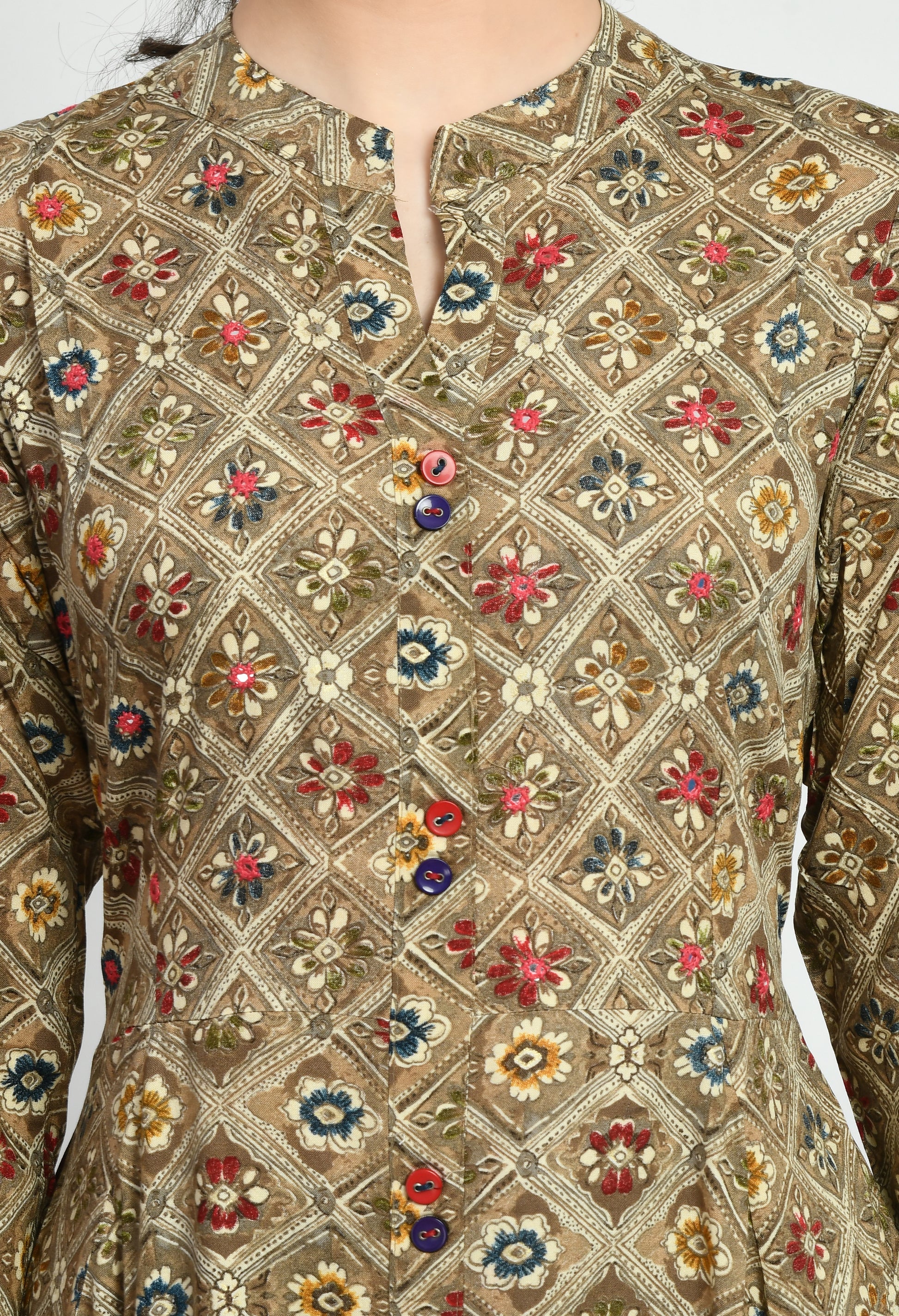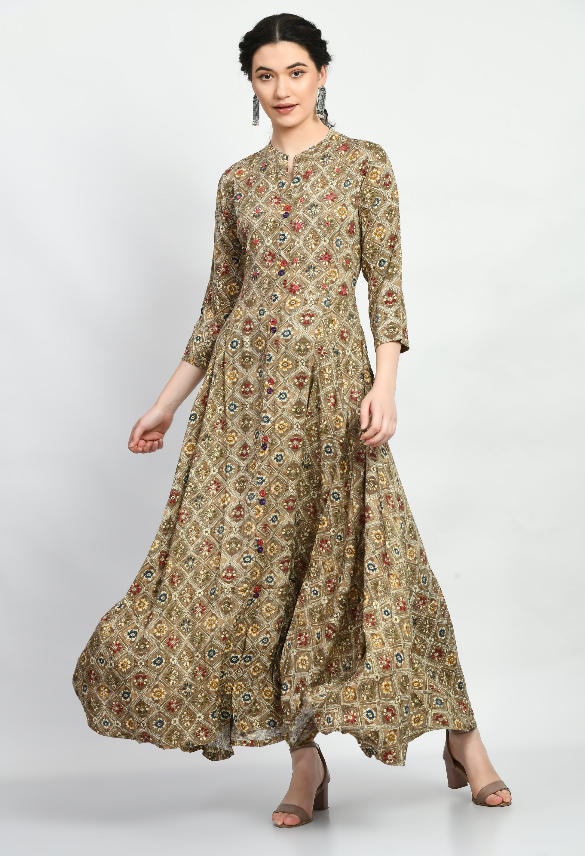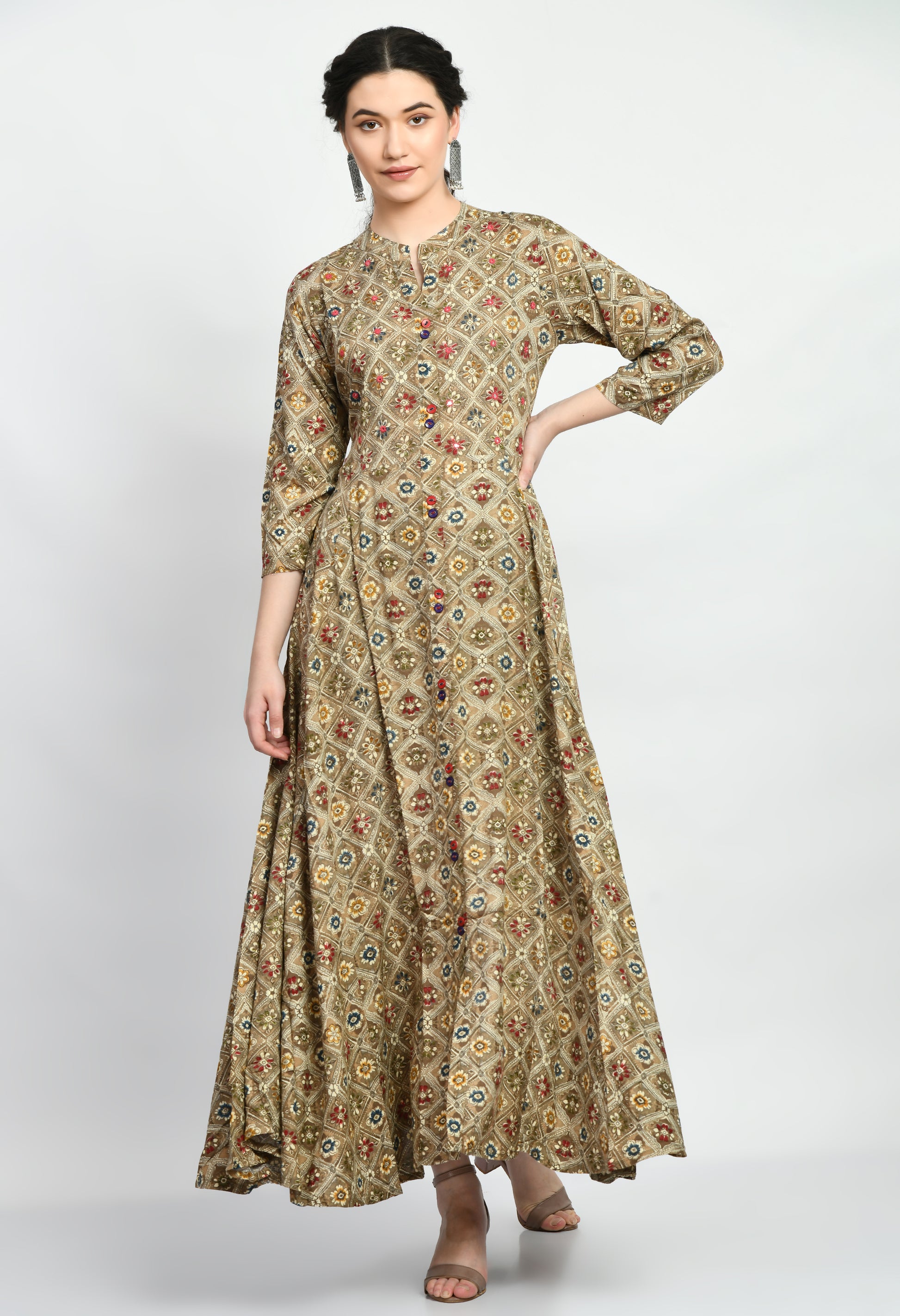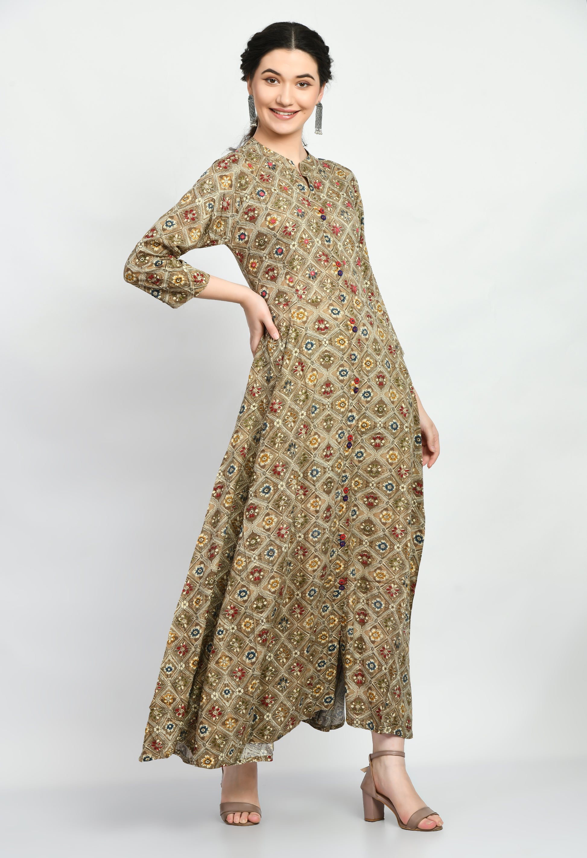 The dress features an all-over traditional printed pattern that adds a timeless ethnic appeal, making it suitable for both casual and festive occasions. It comes with a stylish front button placket and a subtle front slit that enhances ease of movement. The 3/4 length sleeves provide a balanced and classy look, perfect for everyday wear, office wear, festive gatherings, or special occasions.