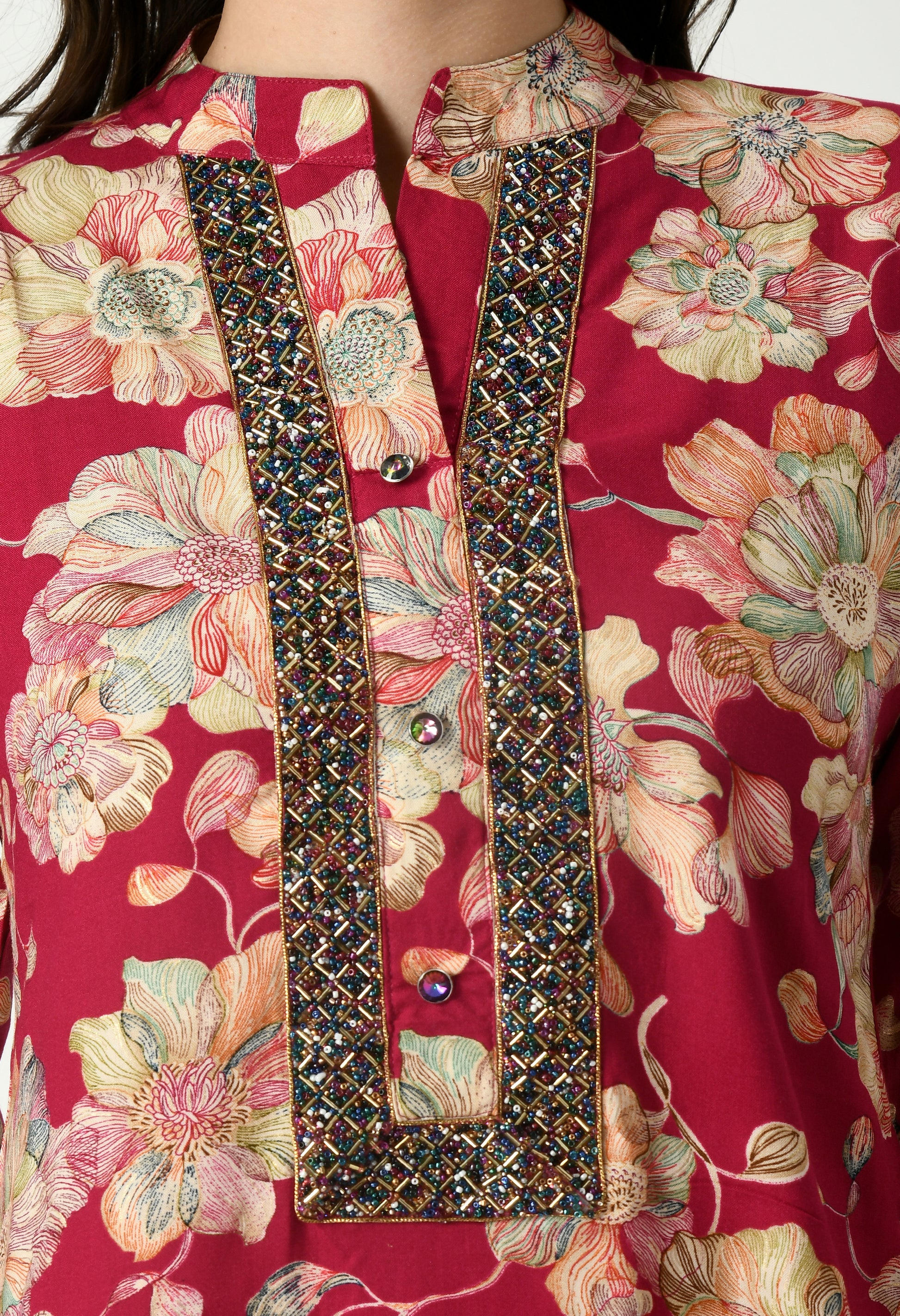 Elevate your everyday ethnic style with this women’s rayon co-ord set, crafted for comfort and effortless elegance. Made from soft and breathable rayon fabric, this set features an all-over floral print that adds a vibrant and graceful appeal. The top is designed with a mandarin neckline, a decorative front placket, and 3/4th sleeves for a refined look. Paired with matching straight-fit printed pants finished with detailed hems, this co-ord set is perfect for casual outings, festive day wear, office styling, or relaxed gatherings.