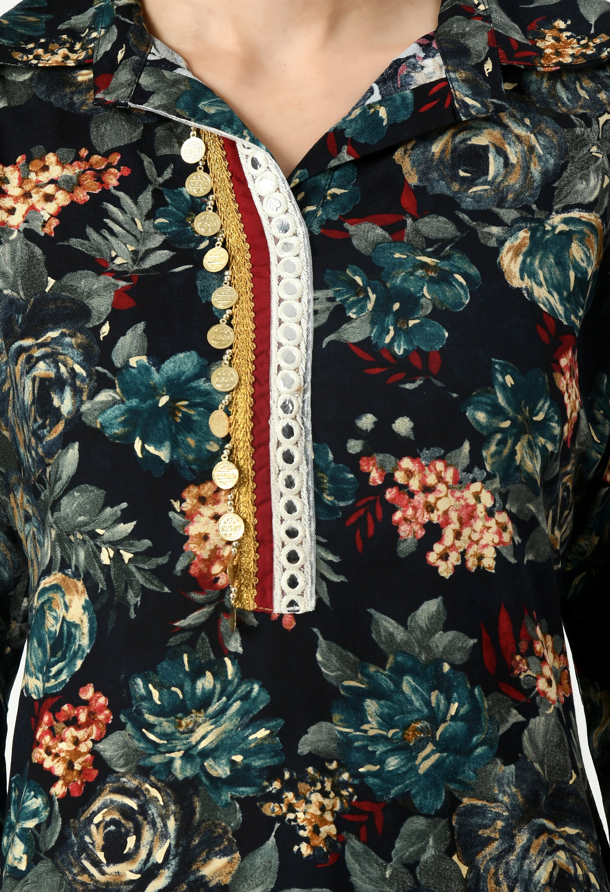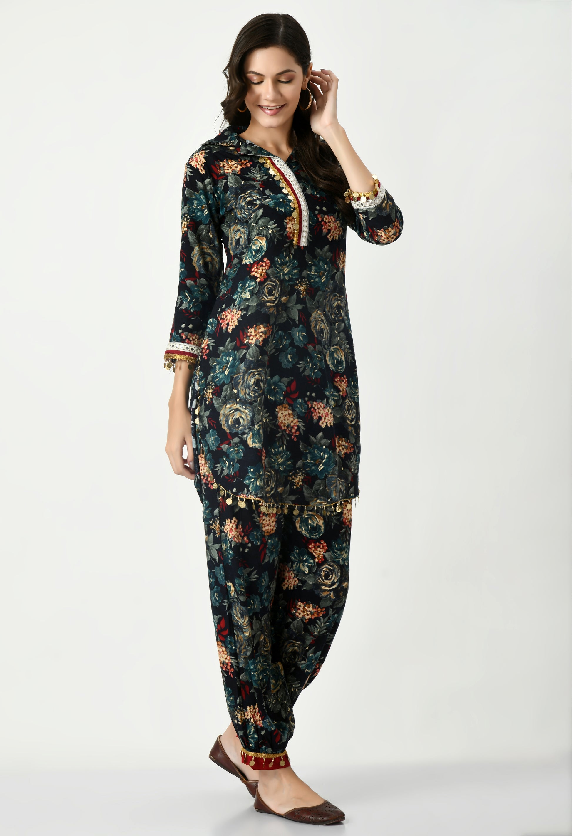 Elevate your ethnic-fusion wardrobe with this women’s Pathani co-ord set crafted from soft and breathable rayon fabric for all-day comfort. The set features an all-over floral printed pattern that adds a rich and elegant look. The Pathani-style top is designed with a straight silhouette, a stylish front placket, and 3/4 sleeves detailed with decorative lace and tassel accents for a refined finish. The matching straight-fit pants come with a coordinated print and embellished hem detailing, completing the cohesive look. Ideal for festive gatherings, casual occasions, daytime events, or elegant everyday wear, this co-ord set blends traditional charm with modern comfort.