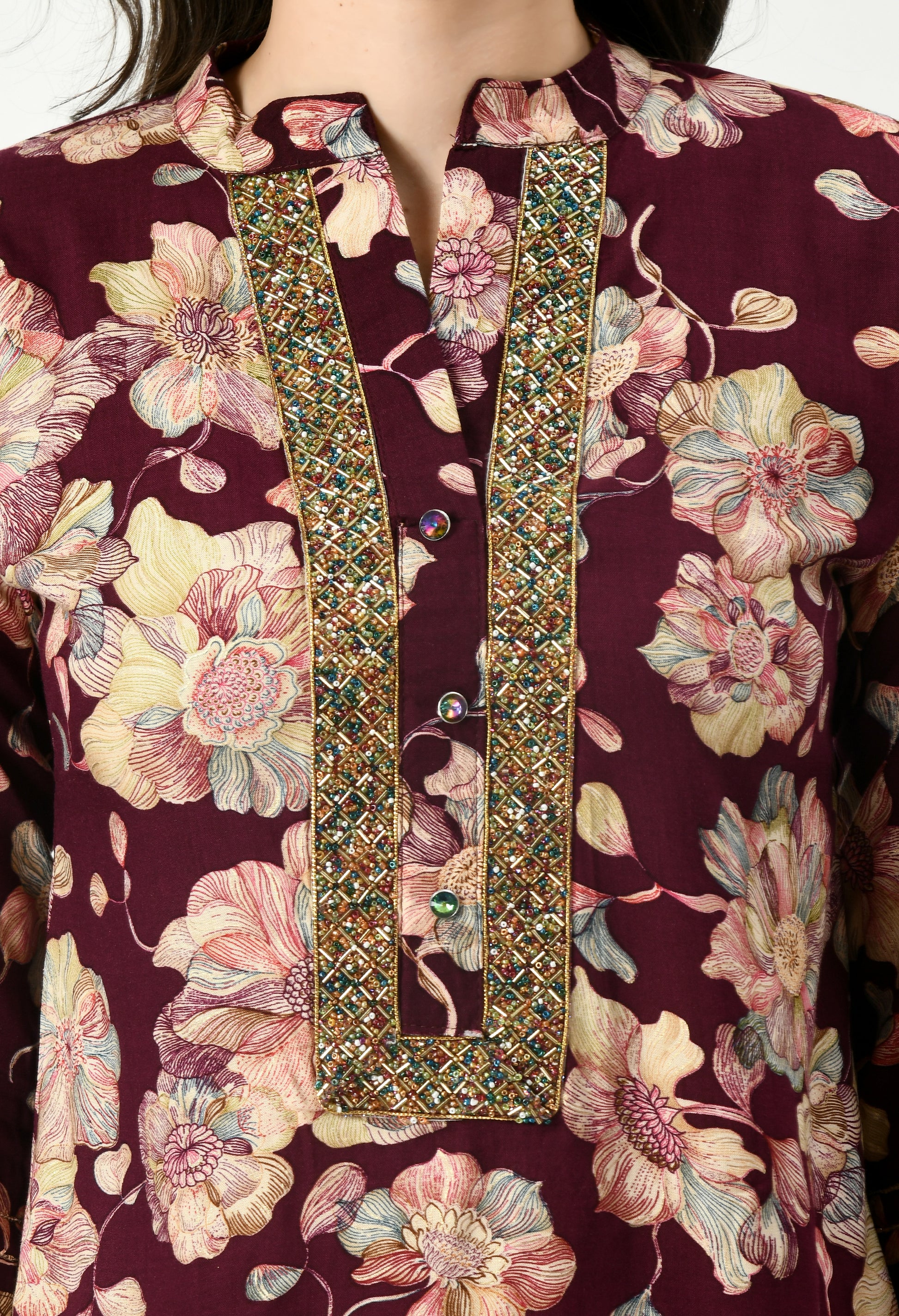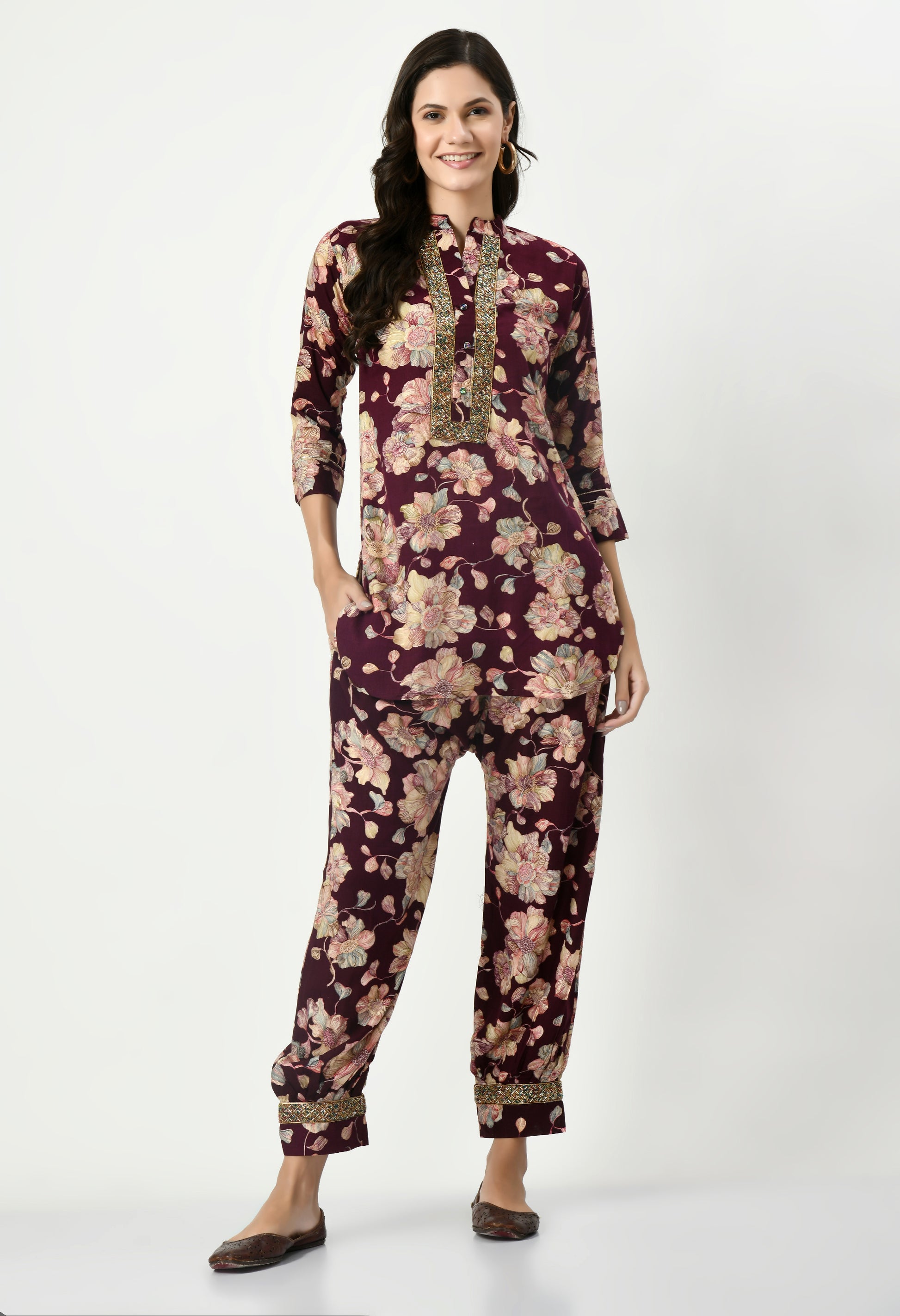 Upgrade your everyday ethnic wardrobe with this women’s rayon co-ord set, designed for comfort and effortless style. Crafted from soft and breathable rayon fabric, this set features an elegant all-over floral printed pattern that adds a refined and graceful look. The top is styled with a straight silhouette, a decorative front placket, and 3/4 sleeves that enhance its classic appeal. The matching pants come with a coordinated floral print and a relaxed fit, finished with embellished hems for a polished look. Ideal for casual outings, festive day wear, office wear, or family gatherings, this co-ord set blends comfort with timeless charm.