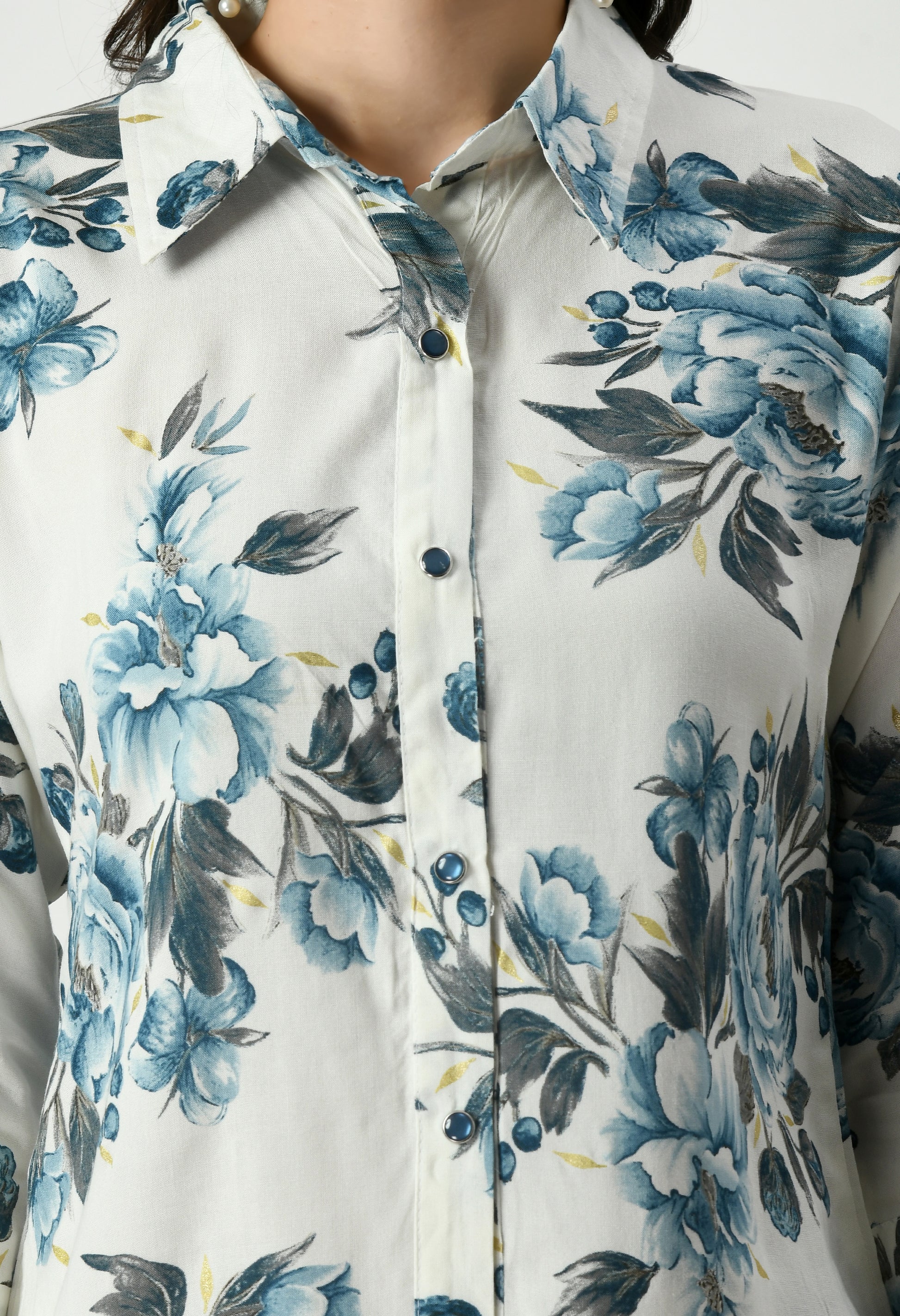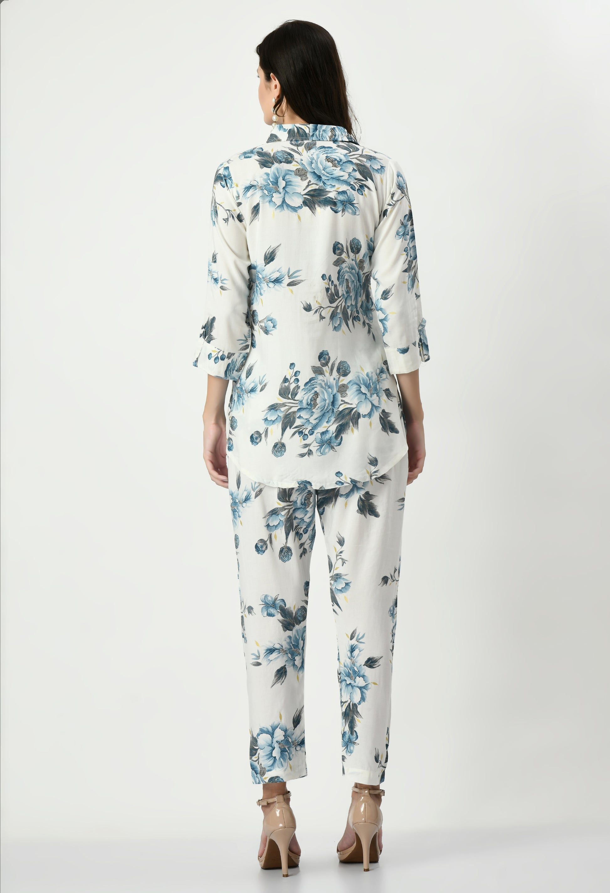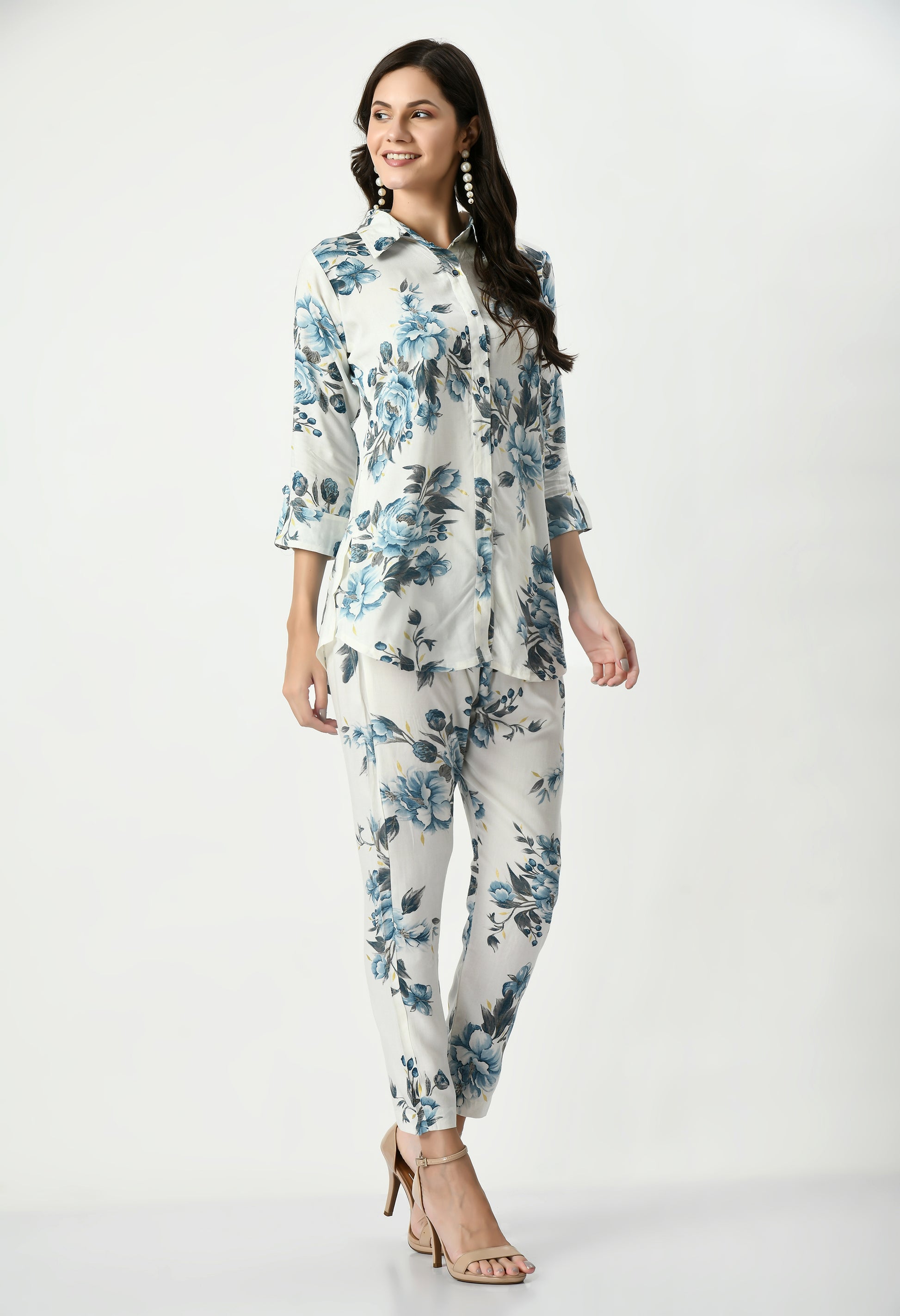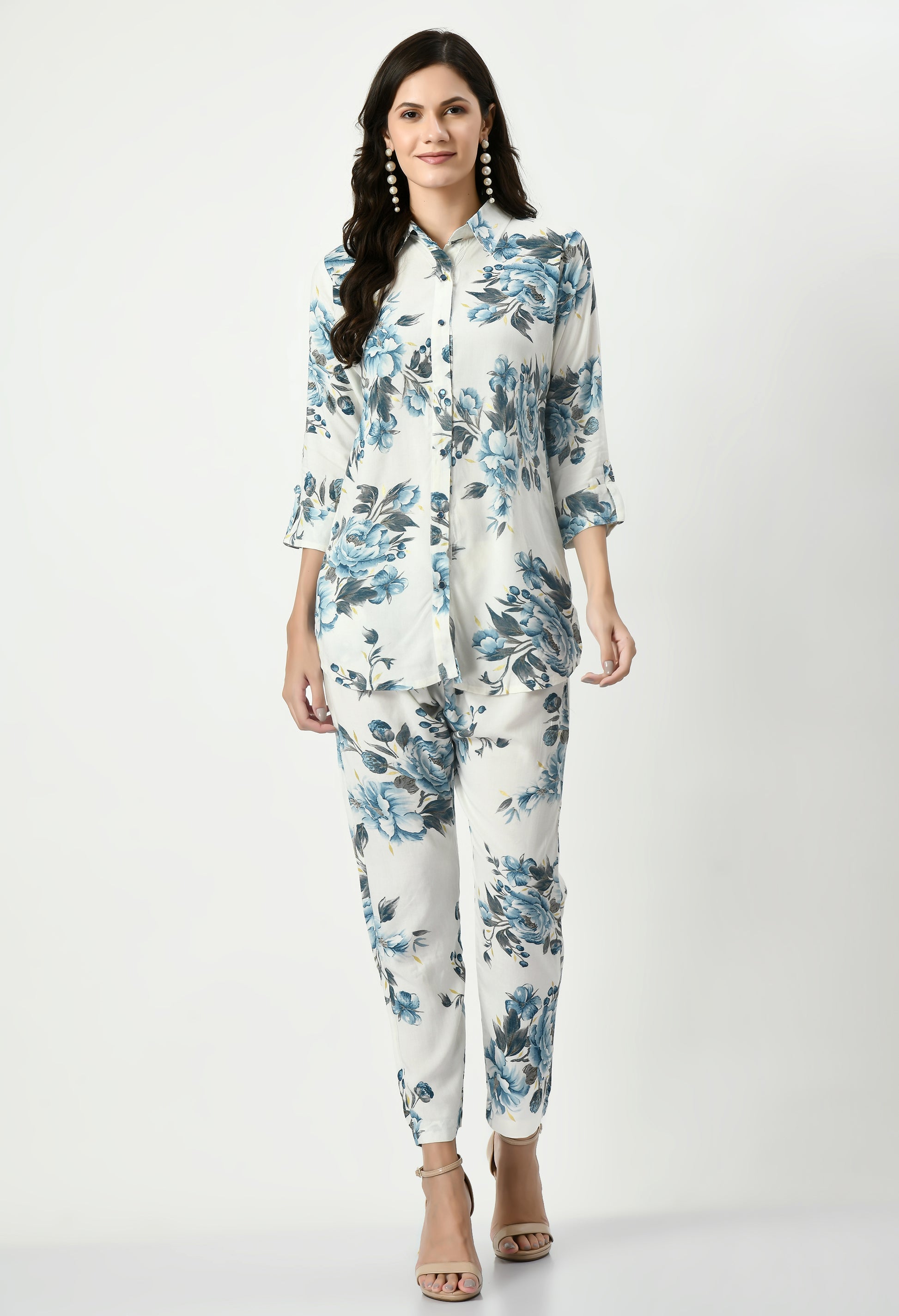 The top features a floral-inspired pattern with a delicate all-over printed design that adds a graceful and feminine touch. Styled with three-quarter sleeves, it offers a balanced look that is both comfortable and polished. The matching pants complement the top with the same coordinated floral print, creating a harmonious and well-put-together ensemble. The lightweight rayon fabric drapes smoothly on the body, making it suitable for all-season wear.