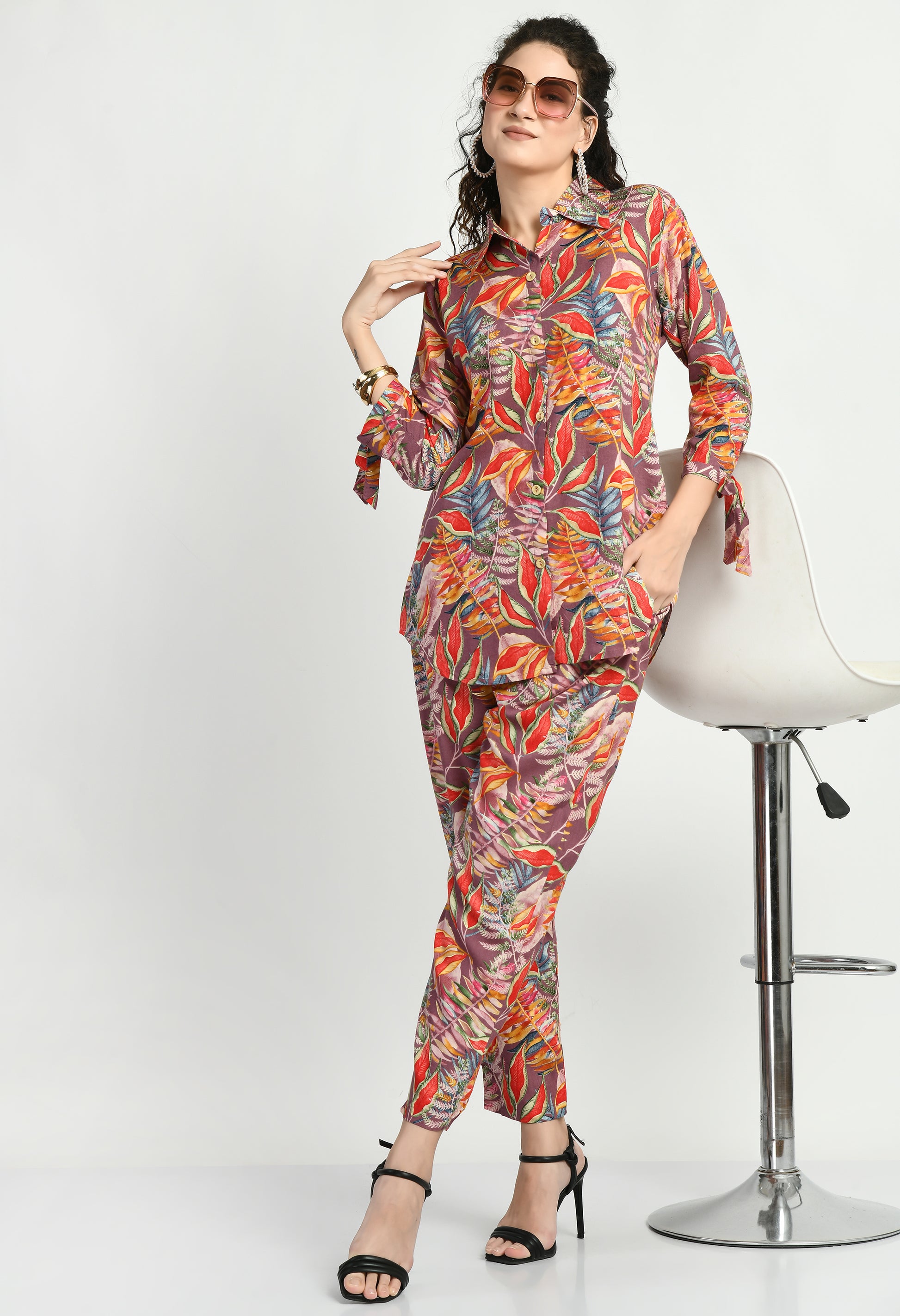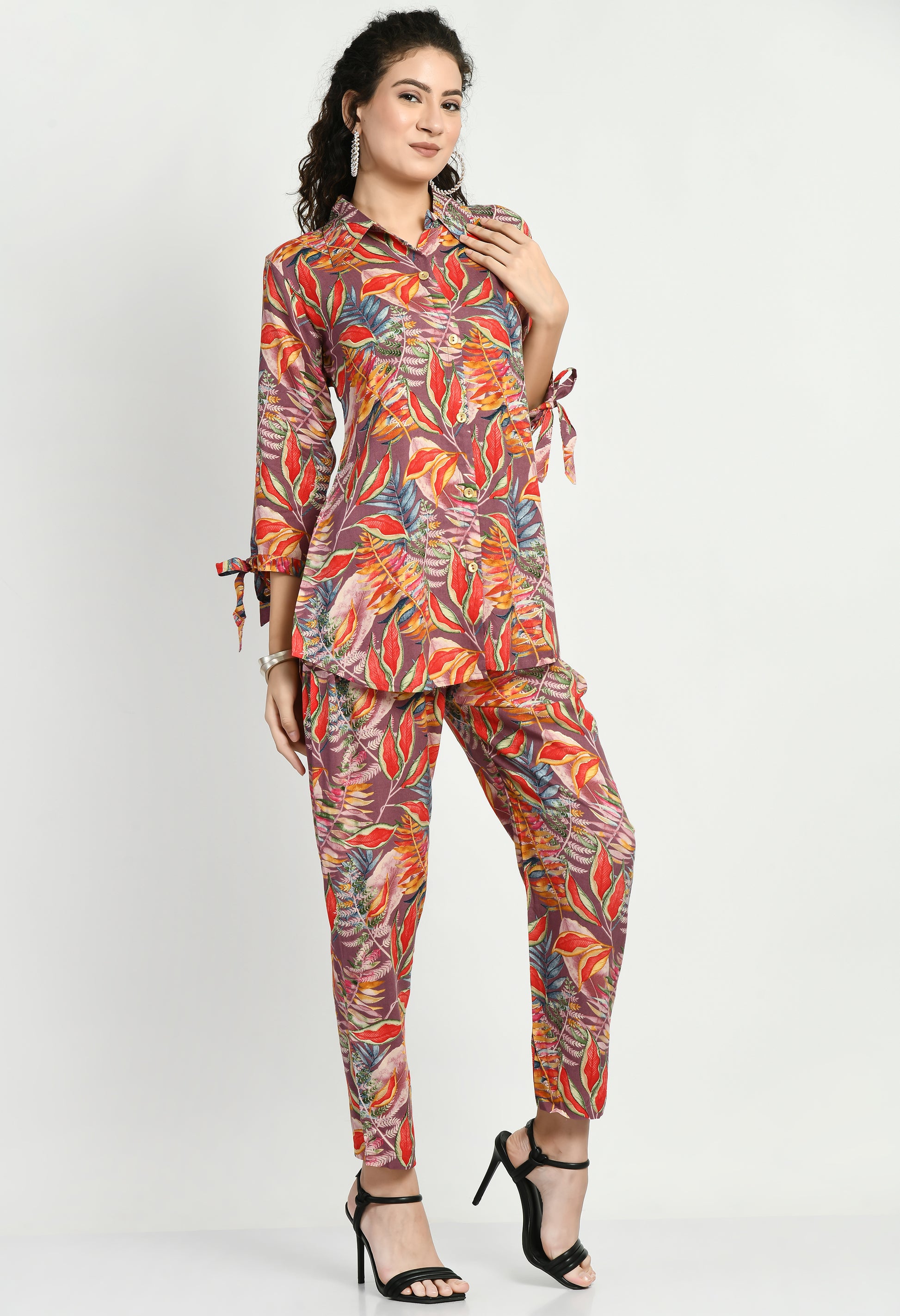 Elevate your everyday style with this women’s rayon co-ord set. Crafted from soft and breathable rayon fabric, this set features a vibrant floral printed pattern that adds a fresh and stylish touch. The shirt-style top comes with a front button closure and trendy 3/4 sleeves with tie-up detailing, paired with matching straight-fit printed pants. Comfortable and versatile, this co-ord set is perfect for casual outings, travel, office wear, and daily styling.