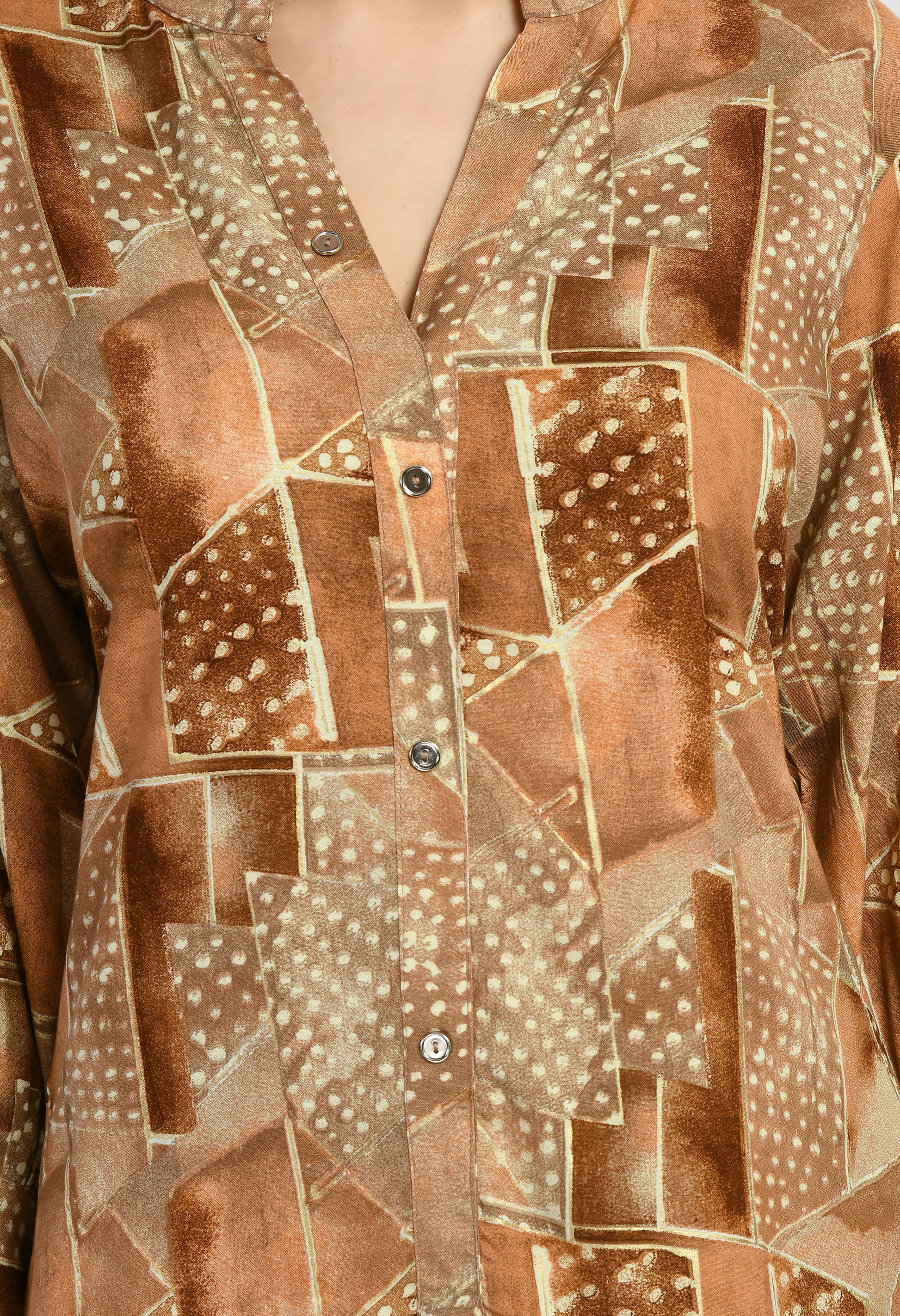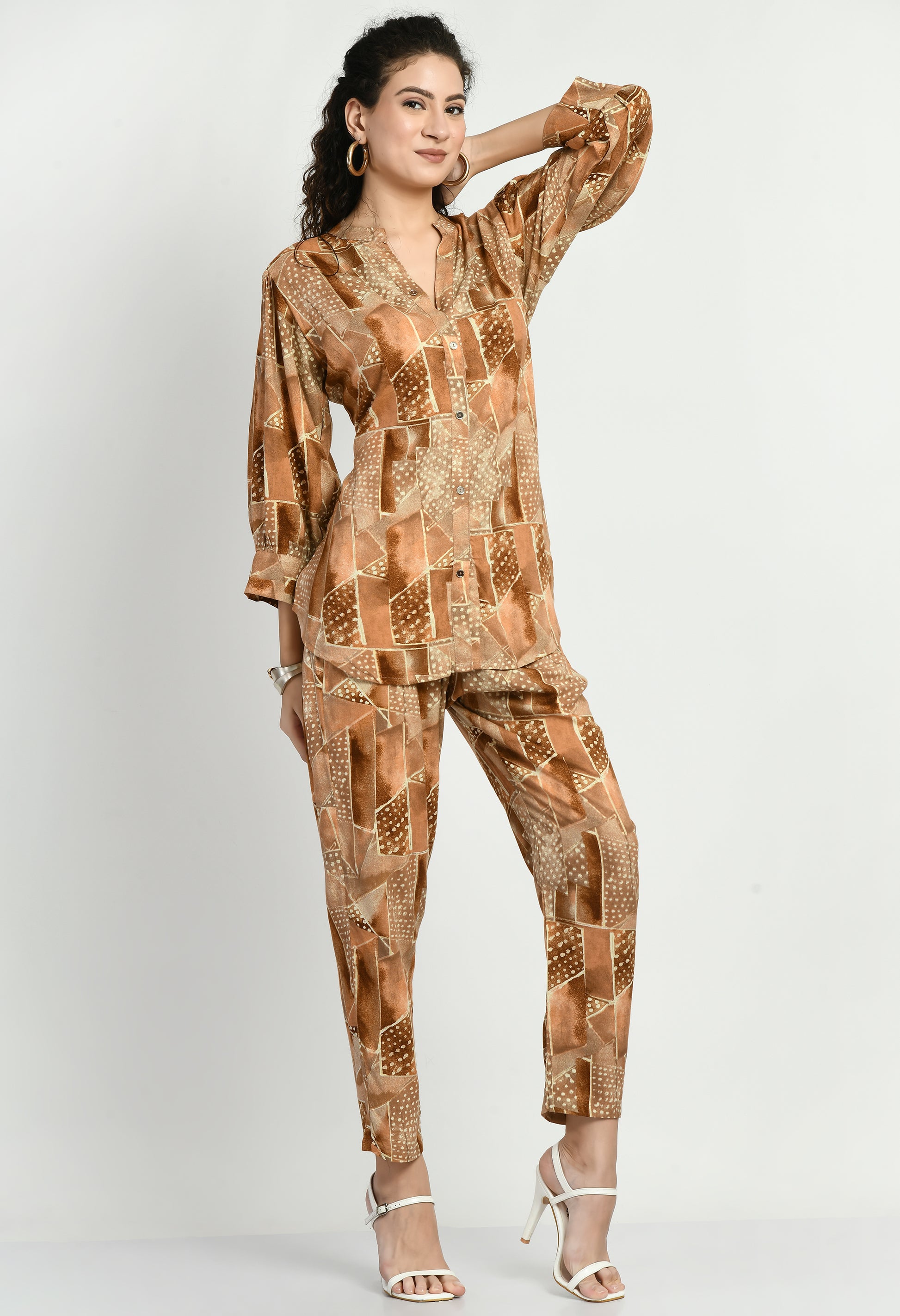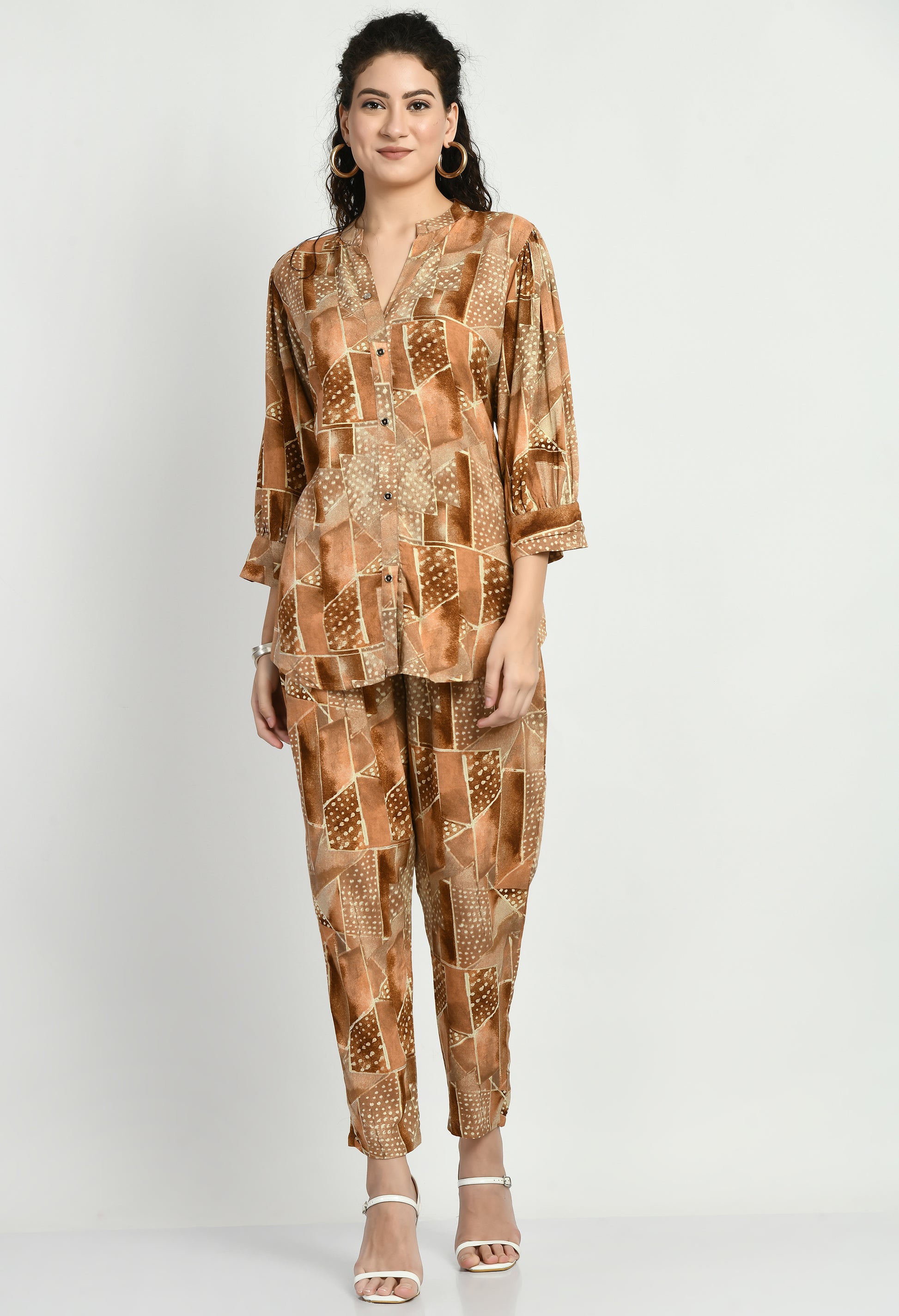 Upgrade your everyday wardrobe with this women’s rayon co-ord set crafted from soft, breathable fabric for all-day comfort. The set features a stylish printed shirt-style top with a front button closure and elegant 3/4 sleeves finished with a subtle cuff detail. The eye-catching geometric printed pattern adds a modern touch, while the matching straight-fit pants complete the coordinated look. Perfect for casual outings, office wear, travel, and daily styling, this co-ord set offers effortless style with comfort.