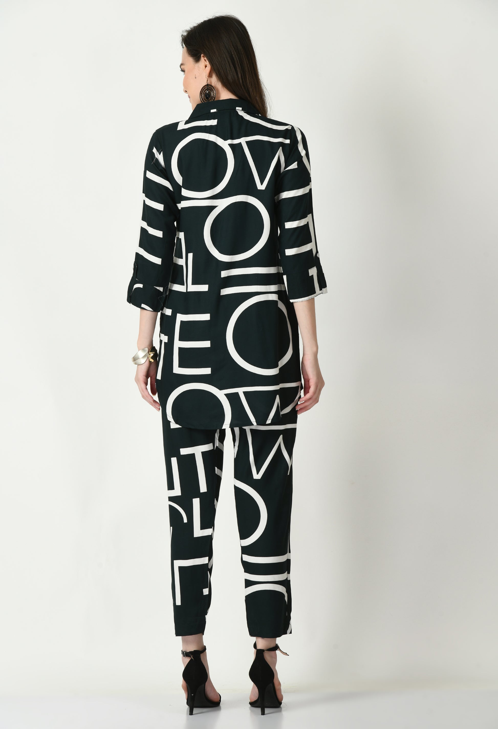 The top showcases a contemporary abstract pattern with a graphic all-over print, adding a chic and fashion-forward touch. Styled with three-quarter sleeves, it offers ease of movement while maintaining a polished silhouette. The coordinated pants feature the same abstract printed design, creating a cohesive and stylish look. The soft rayon fabric ensures a smooth drape and all-day comfort, making this set suitable for all seasons.
