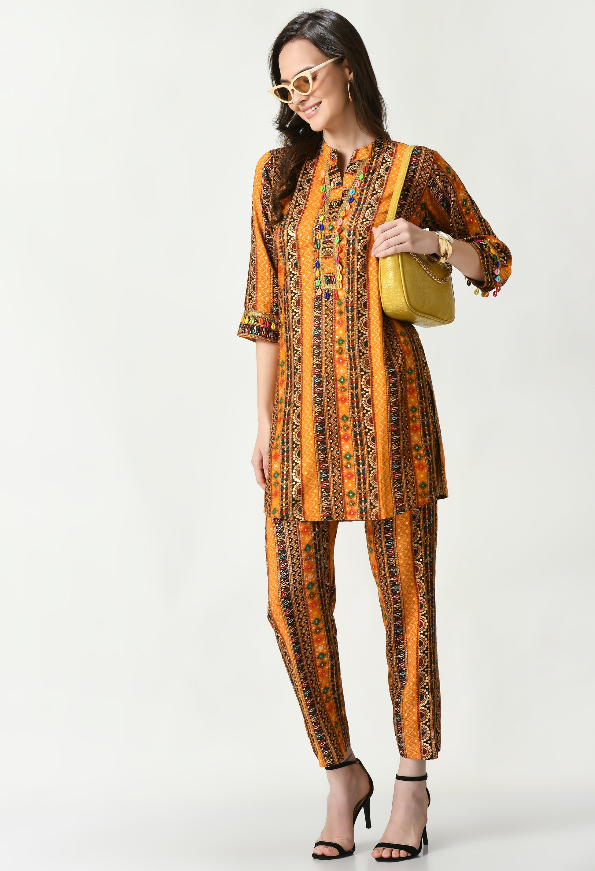 The kurta features a traditional ethnic-inspired pattern with a rich all-over printed design, enhanced by subtle decorative detailing on the front for added appeal. Styled with three-quarter sleeves, it provides comfort while maintaining an elegant and polished look. The matching pants complement the kurta with the same coordinated ethnic print, creating a well-balanced and stylish ensemble. The lightweight rayon fabric ensures a smooth drape and effortless movement.
