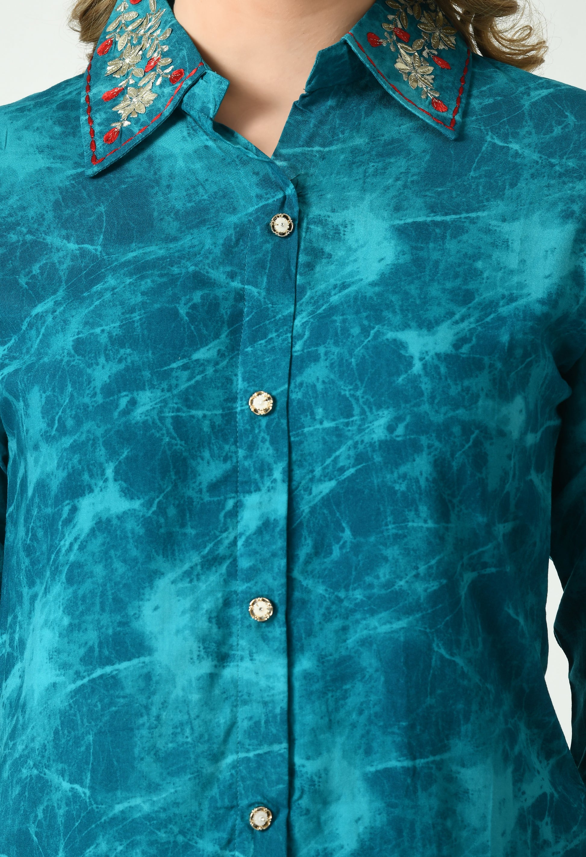 The top showcases a subtle abstract marble-inspired pattern with a smooth all-over printed finish that gives the outfit a refined and contemporary look. Designed with a shirt-style collar and front button closure, it adds structure while remaining comfortable. The three-quarter sleeves feature delicate embroidered detailing at the cuffs, enhancing the overall design with a touch of sophistication. The matching straight-fit pants mirror the same print, offering a clean and cohesive appearance.