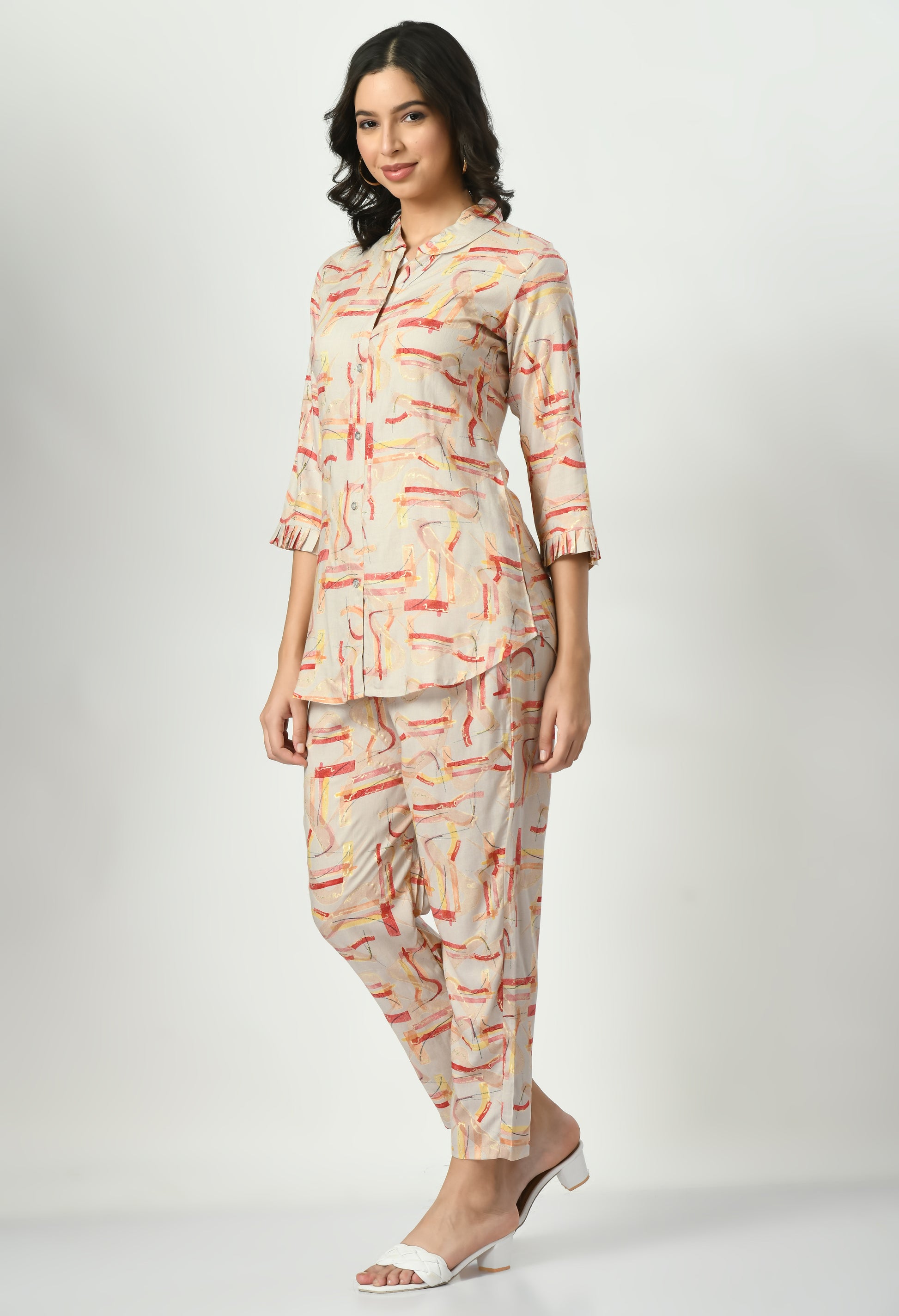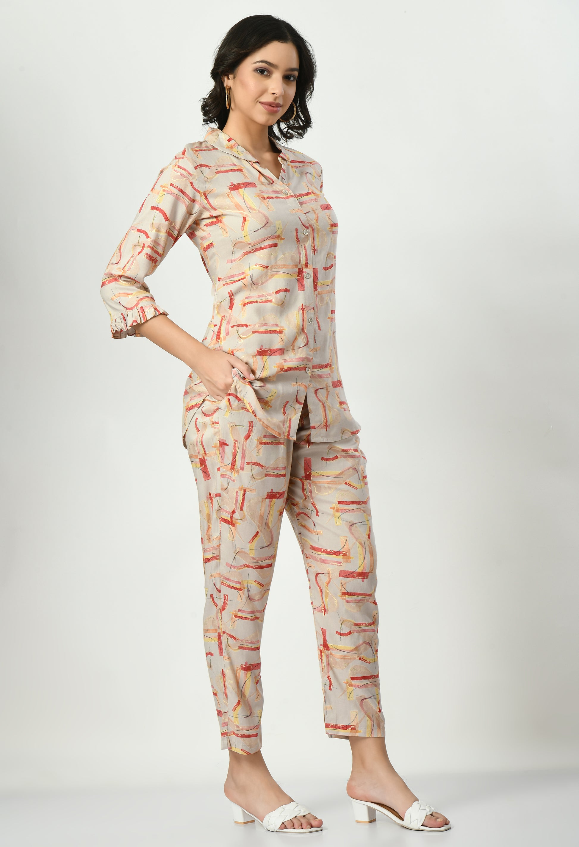 The top features an abstract-inspired pattern highlighted with a subtle all-over printed design, offering a modern and minimal appeal. Styled with a shirt-style neckline and three-quarter sleeves finished with a soft cuff, it provides a clean and versatile silhouette. The matching pants follow the same coordinated print, creating a balanced and effortlessly stylish outfit. The lightweight rayon fabric ensures smooth drape and all-day comfort.