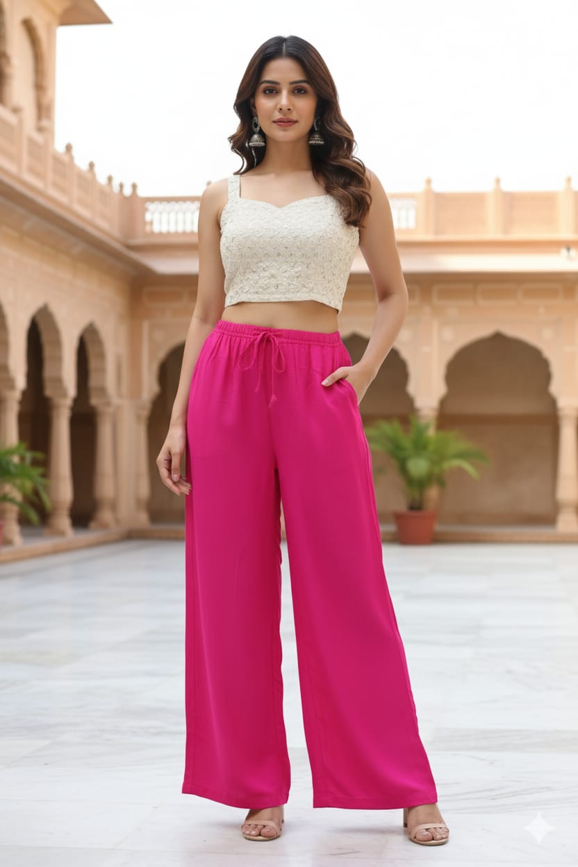Upgrade your everyday comfort with these women’s rayon palazzo pants, designed for effortless style and ease of movement. Crafted from soft and breathable rayon fabric, these full-length palazzos offer a smooth drape and lightweight feel, making them perfect for all-day wear. The elasticated waistband ensures a comfortable and flexible fit, while the solid pattern gives a clean and versatile look that pairs easily with kurtas, tops, and tunics. Ideal for casual wear, office styling, travel, or relaxed daily use, this palazzo is a must-have wardrobe essential for modern women.