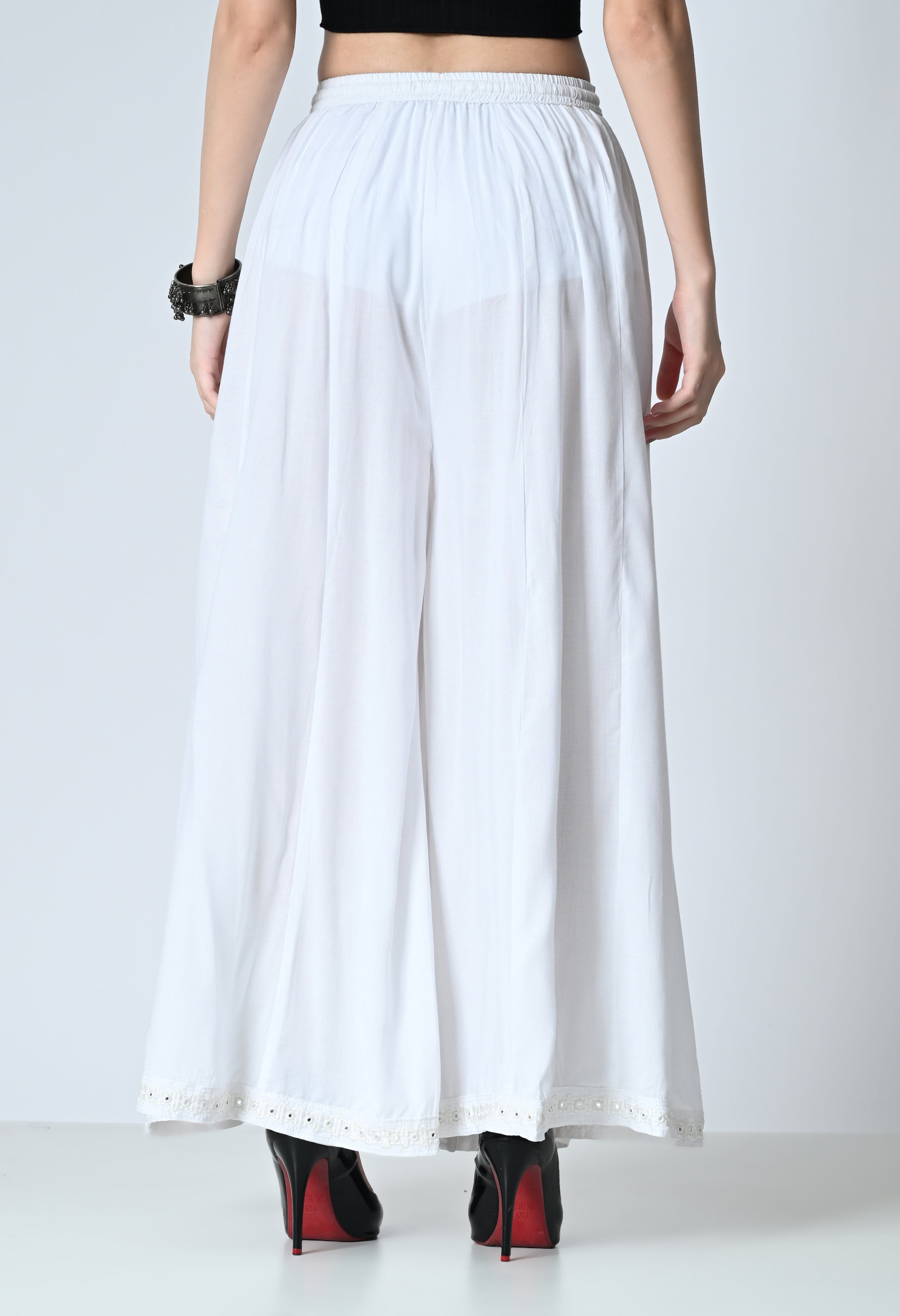 The solid pattern gives it a versatile appeal, while the delicate lace detailing at the bottom hem adds a subtle touch of elegance. Easy to pair with kurtas, tunics, crop tops, or ethnic tops, this rayon palazzo is a must-have wardrobe essential for effortless styling.