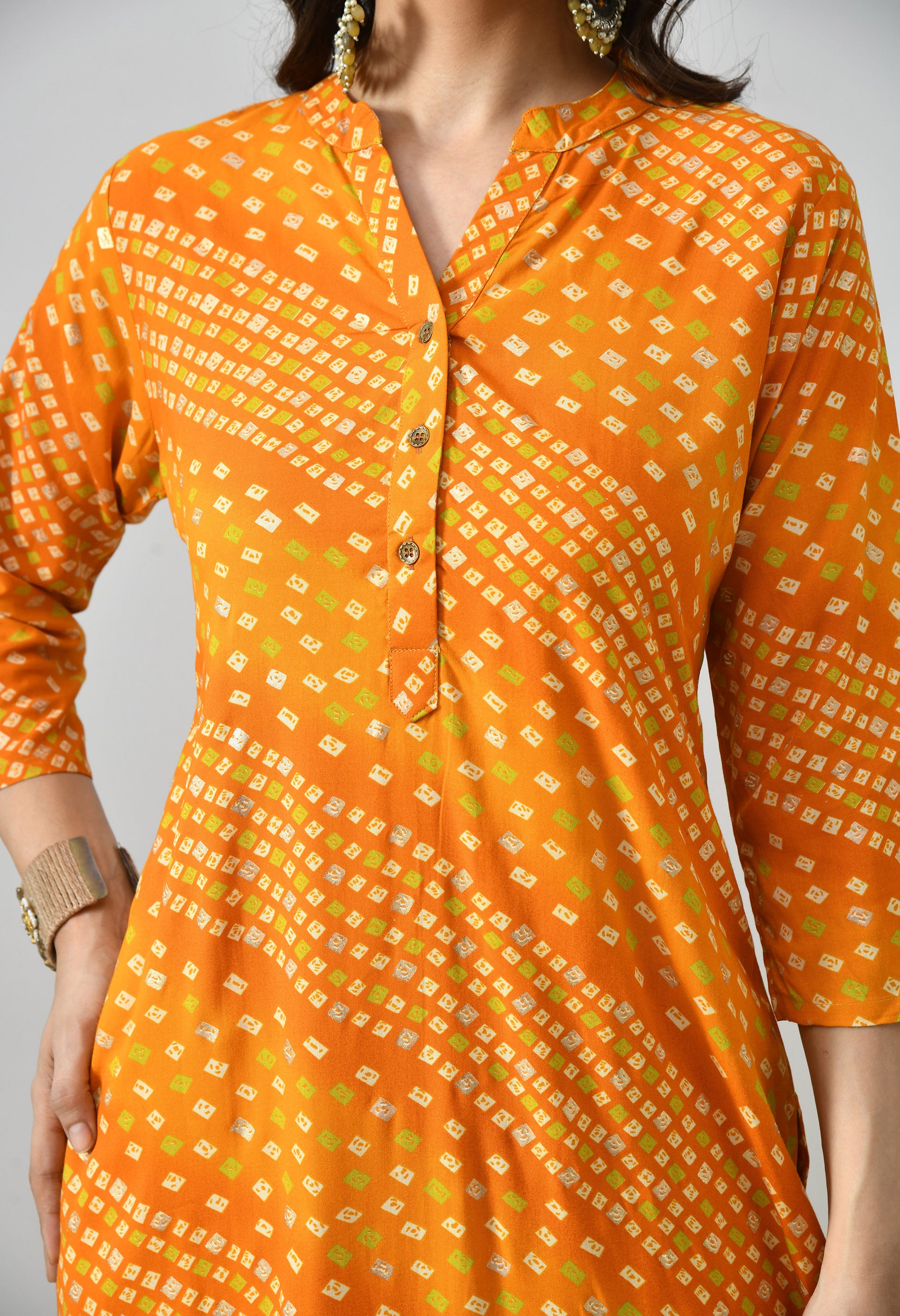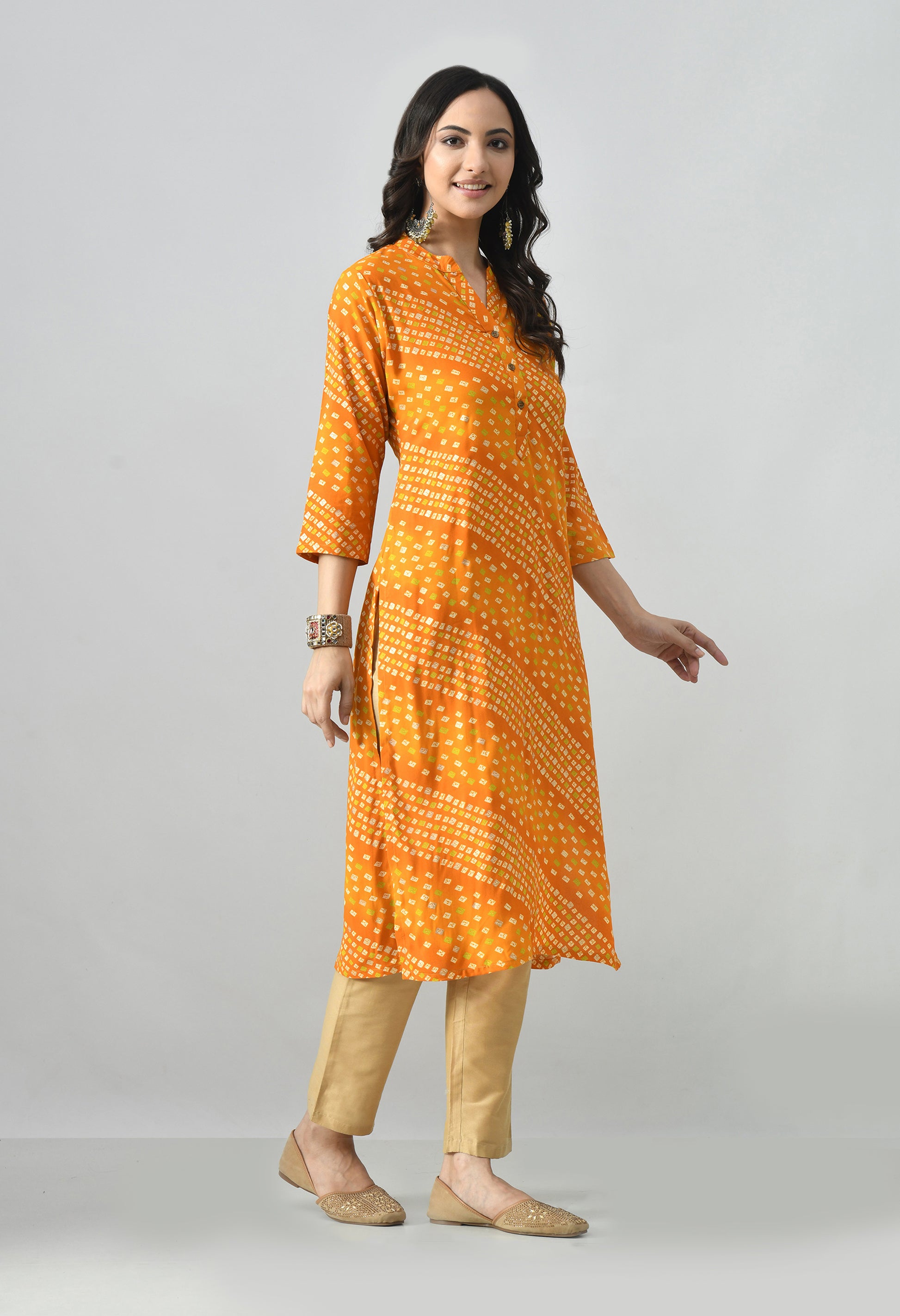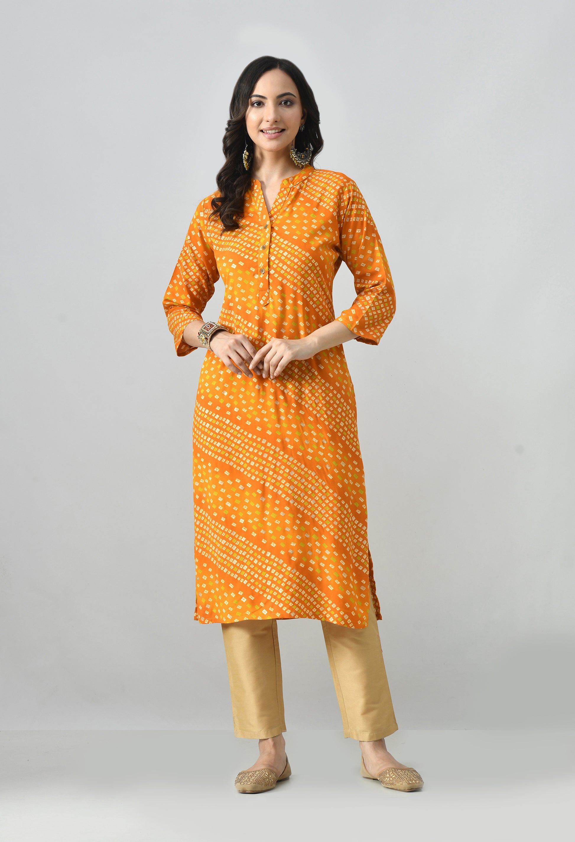 Add graceful charm to your ethnic collection with this rayon kurti featuring an all-over Chanderi print. Crafted from soft, flowy rayon, it offers a comfortable straight fit with a refined traditional touch—perfect for office wear, festive gatherings, or everyday ethnic styling.