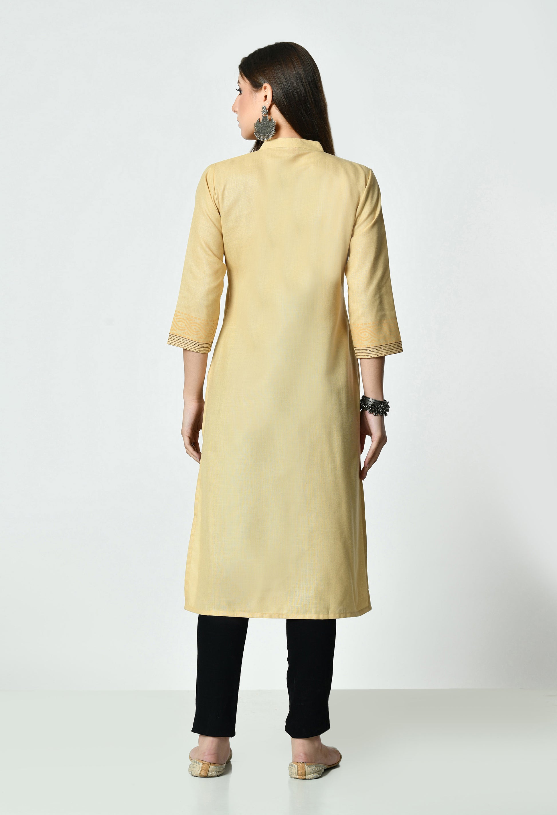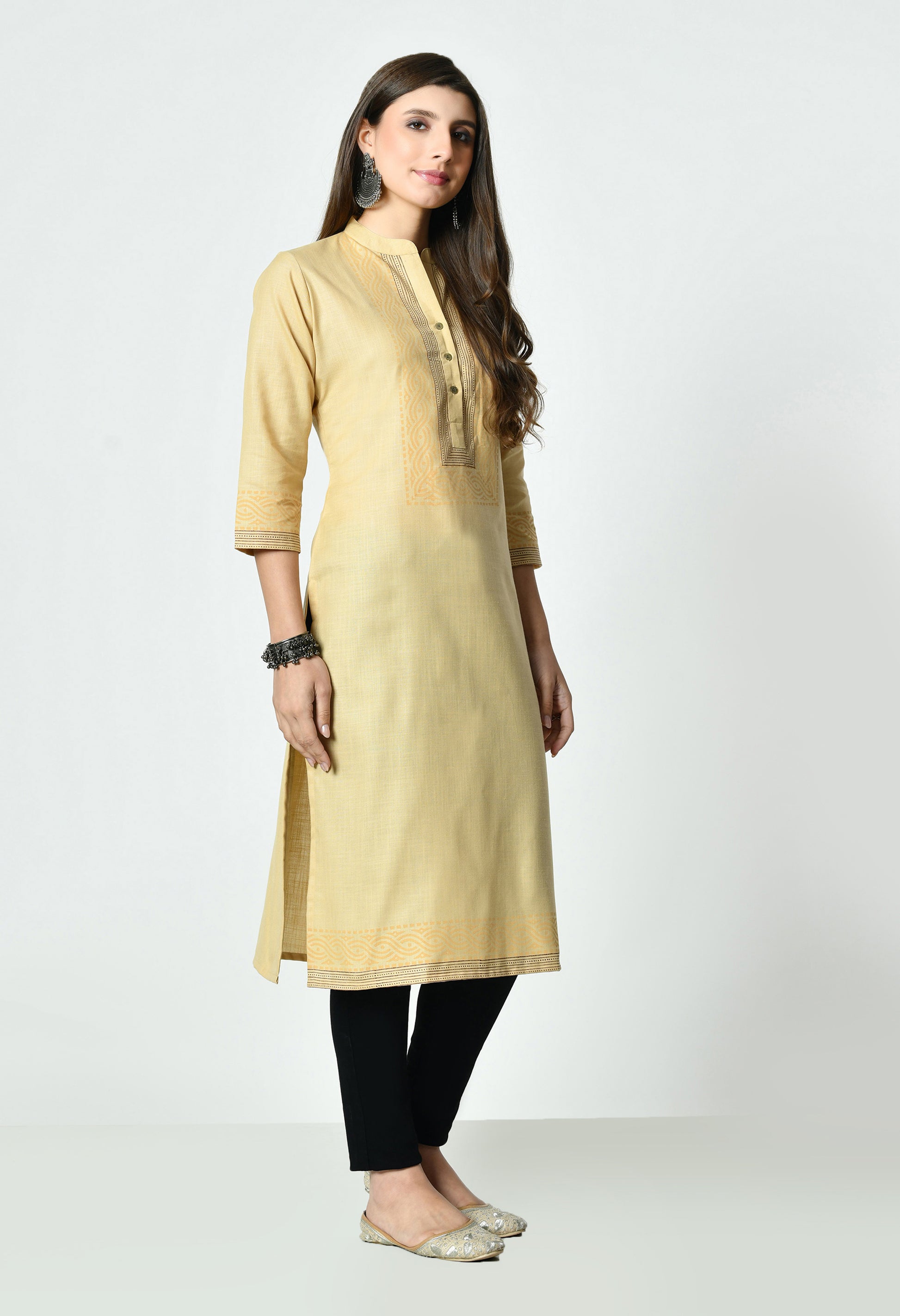Refresh your everyday ethnic look with this block print straight kurti crafted from a comfortable cotton-blend fabric. Featuring all-over block print detailing and a functional button placket that opens fully, it offers ease of wear with timeless style—perfect for office wear, casual outings, or daily comfort.