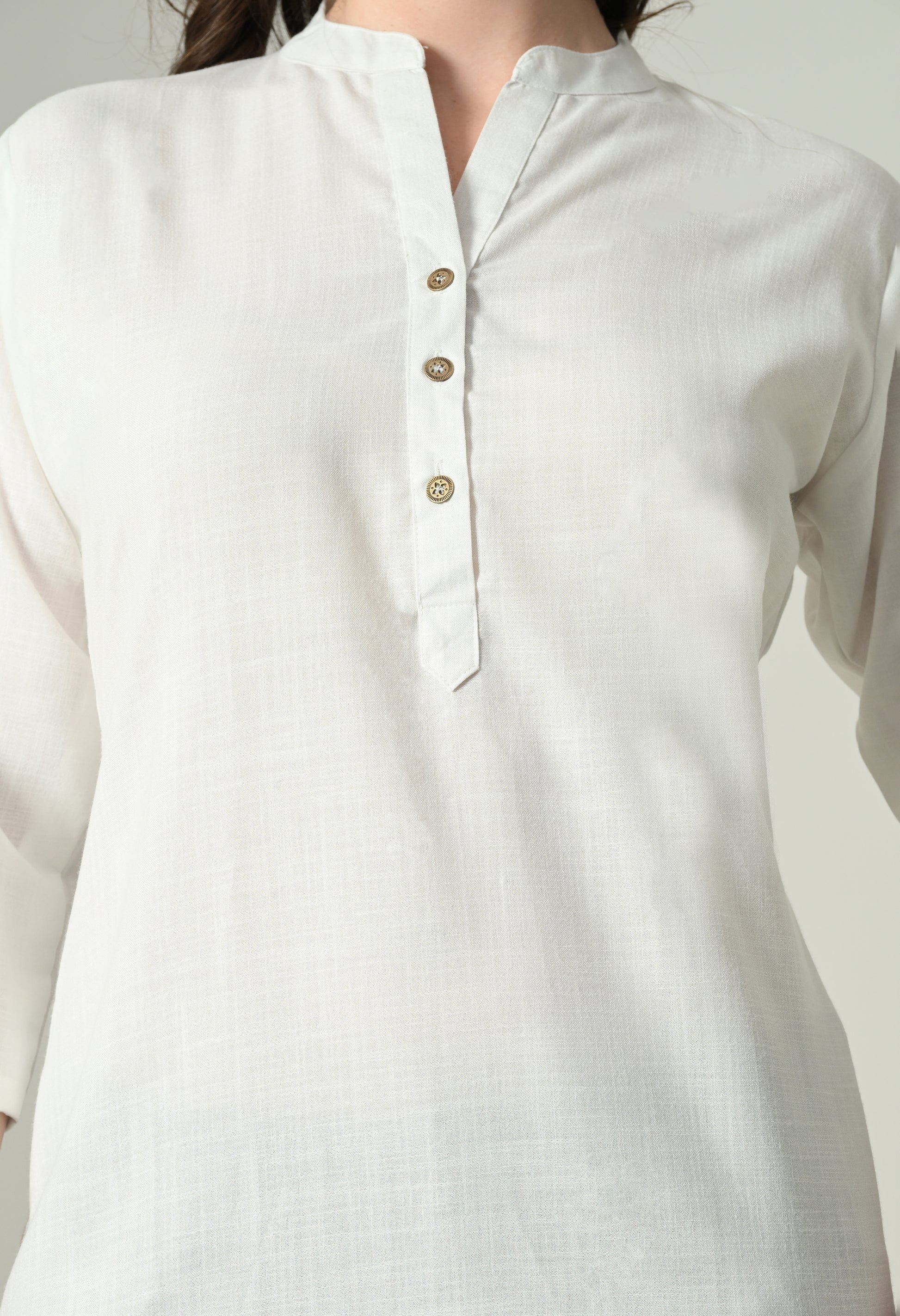 Keep your look effortlessly elegant with this solid straight kurti crafted from a soft cotton-blend fabric. Designed with a classic straight fit, it features a functional button placket that opens fully for added comfort and ease. Perfect for daily wear, office styling, or minimal ethnic looks.