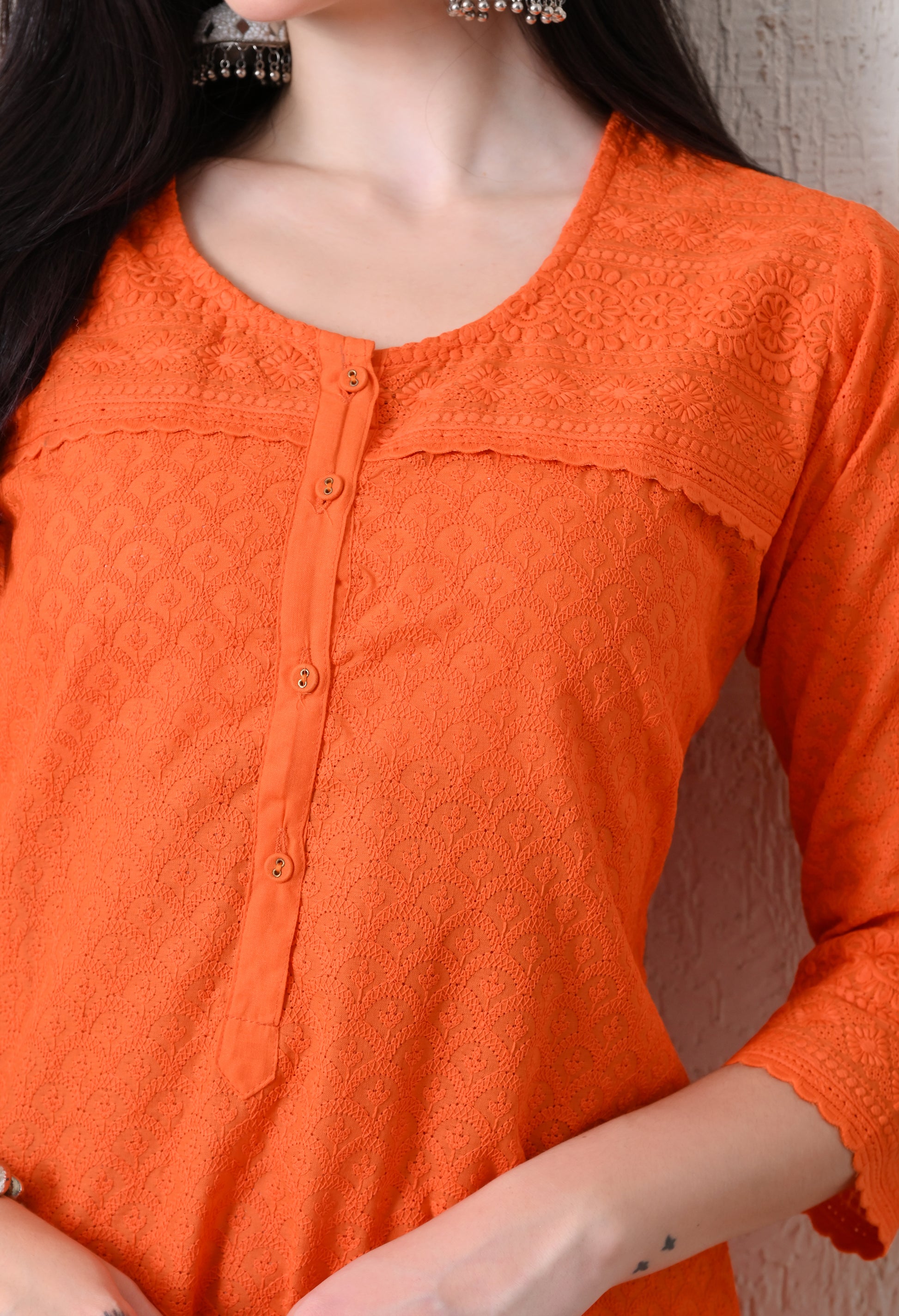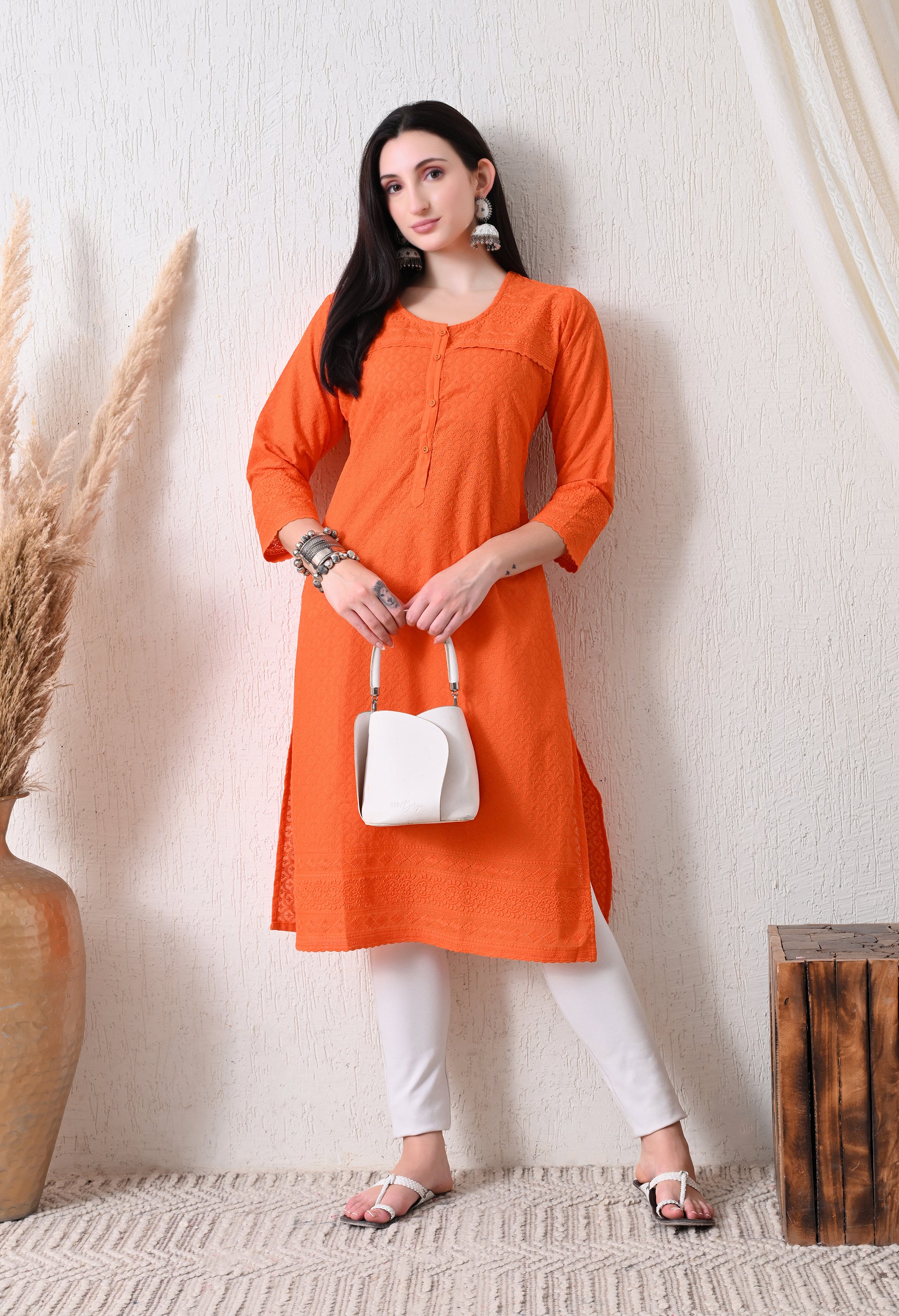 Add timeless charm to your ethnic wardrobe with this cotton kurti featuring delicate all-over embroidery. Crafted from breathable cotton, it offers a comfortable straight fit with subtle detailing—perfect for daily wear, office styling, or casual occasions with a touch of elegance.
