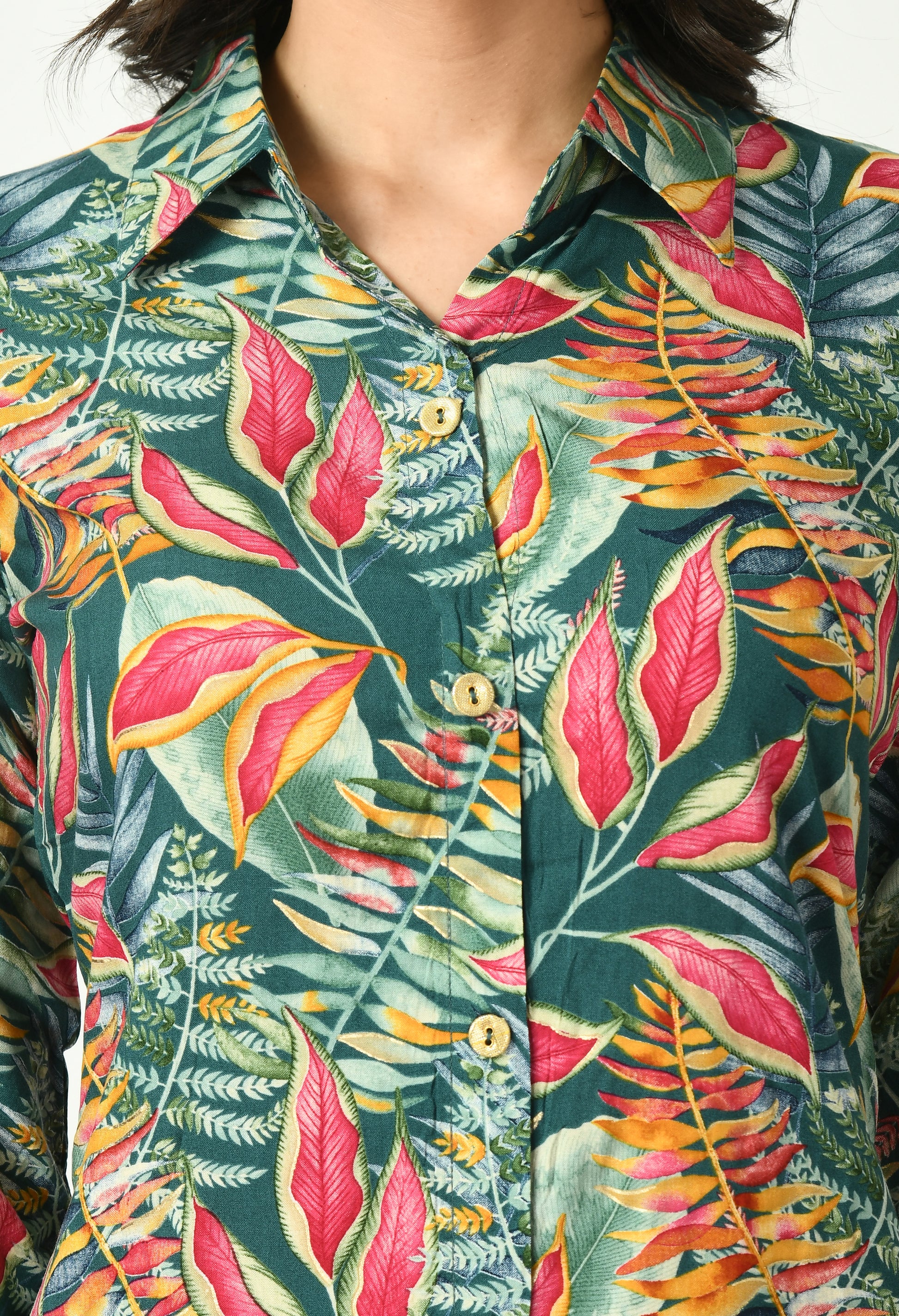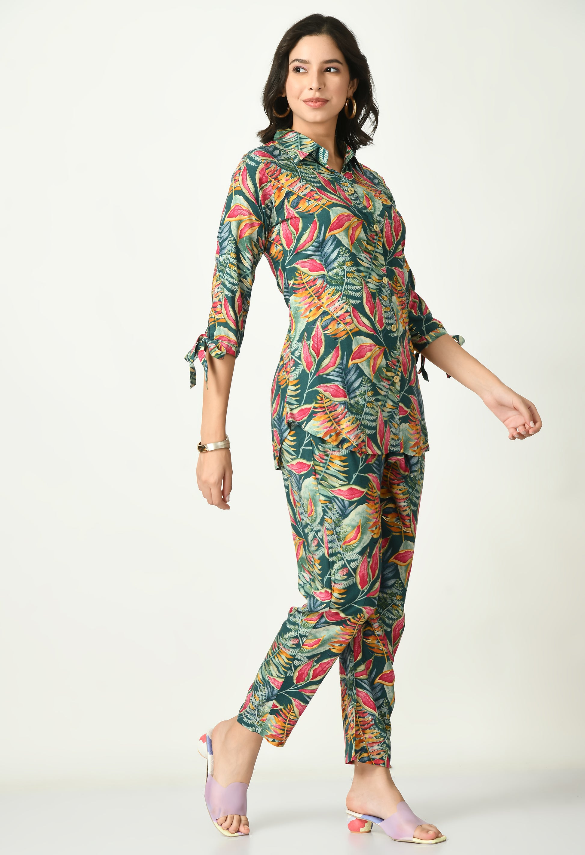 The top features a tropical leaf-inspired pattern highlighted with a vibrant all-over printed design that gives a fresh and contemporary look. Styled with a shirt collar neckline and three-quarter sleeves with tie-up detailing, it adds a subtle statement while remaining easy to wear. The coordinated pants follow the same tropical print, creating a seamless and well-balanced outfit. The lightweight rayon fabric ensures a smooth drape and all-day comfort.